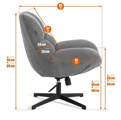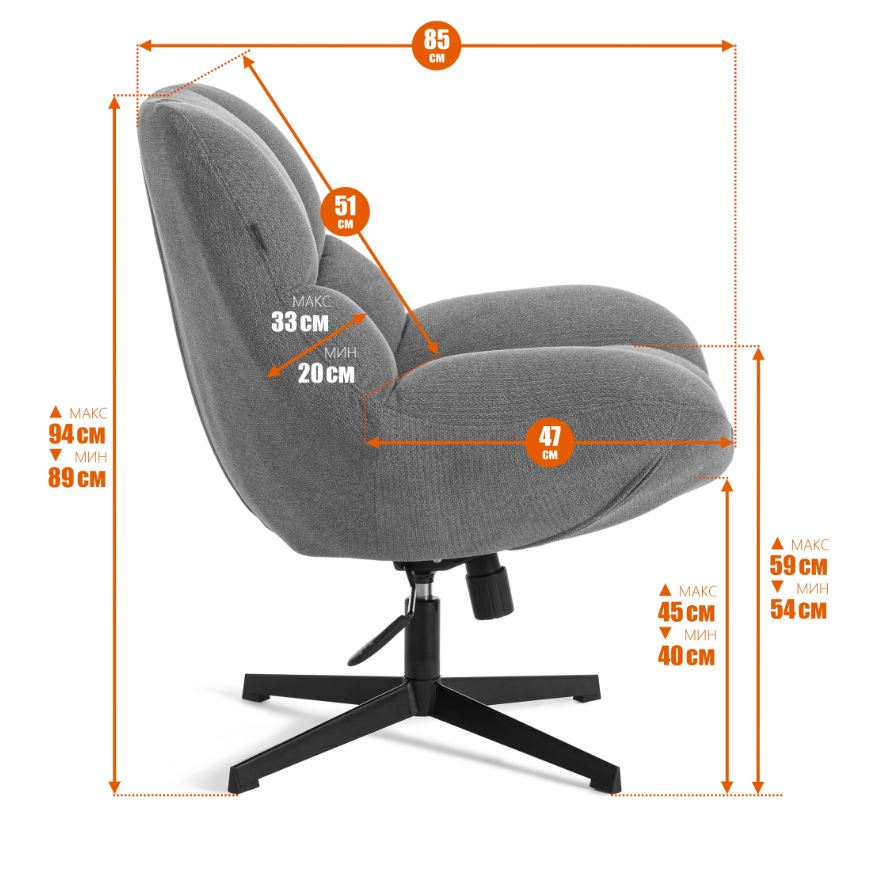 Кресло лаунж Relax / Релакс с пуфом представляем вам идеальное решение для создания уютного уголка в вашем доме – комплект, состоящий из комфортного кресла для отдыха и стильного пуфа. Этот набор призван подарить вам истинное расслабление, сочетая в себе элегантность винтажного стиля и современные технологии комфорта. Кресло для отдыха: Кресло лаунж Relax / Релакс – настоящее воплощение уюта и стиля. Его конструкция продумана до мелочей для вашего максимального удобства. Прочный металлический каркас обеспечивает надежность, а мягкая спинка и сиденье с пружинным блоком, установленные на гнутоклеенном основании, гарантируют непревзойденный комфорт. Кресло легко вращается на 360 градусов, позволяя вам свободно менять положение, а наличие подъемного механизма и механизма качания добавляет функциональности, делая его идеальным для чтения, просмотра фильмов или просто отдыха. Основание кресла выполнено в виде элегантной металлической четырехлучевой крестовины с треугольным сечением. Черное порошковое покрытие с деликатной шагренью придает ему изысканный вид, а пластиковые подпятники защищают ваш пол от царапин. Обивка кресла лаунж Relax / Релакс выполнена из приятного на ощупь велюра с эффектом букле, доступного в двух благородных цветовых решениях, что позволяет подобрать идеальный вариант для вашего интерьера. Пуф для ног: Дополните свой отдых с помощью этого стильного пуфа. Он создан для того, чтобы стать идеальной подставкой для ваших ног, превращая кресло в полноценное место для релаксации. Пуф также оснащен прочной металлической четырехлучевой крестовиной с треугольным сечением и пластиковыми подпятниками, обеспечивая устойчивость и защиту пола. Мягкое, эргономичное сиденье пуфа наполнено пенополиуретаном различной плотности и аэропухом, что создает ощущение воздушной мягкости и комфорта. Обивка выполнена из того же высококачественного велюра или букле, что и кресло, создавая гармоничный ансамбль. Общие характеристики: Этот комплект кресла и пуфа станет настоящим украшением вашего дома, гармонично вписываясь как в современные, так и в винтажные интерьеры. Он идеально подойдет для гостиной, спальни или кабинета, создавая атмосферу уюта и спокойствия. Размеры кресла: 75 см (ширина) x 85 см (глубина) x 94 см (высота), вес: 13,6 кг. Размеры пуфа: 53 см (ширина) x 35 см (глубина) x 42,5 см (высота), вес: 4,25 кг.