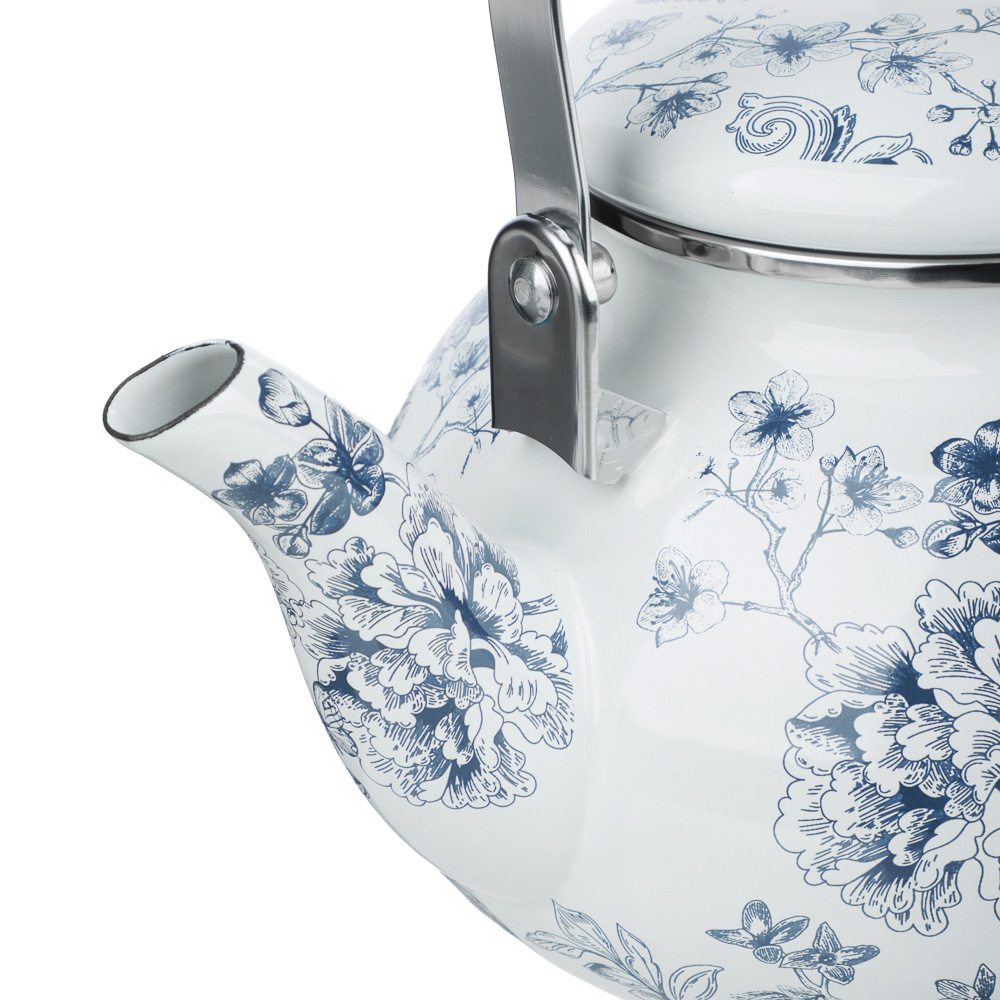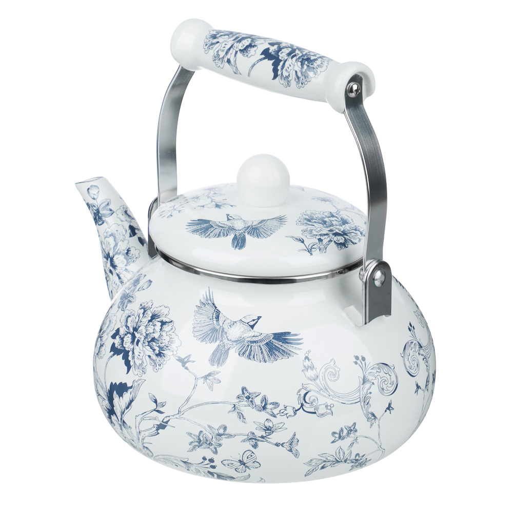 Чайник эмалированный тм VETTA «Флорал», 2,5 л сочетает в себе традиционный дизайн для уютного и душевного чаепития и современный функционал с ферромагнитным дном для индукционных плит. Стойкое эмалированное покрытие защищает сталь от коррозии, не влияет на вкусовые качества воды и легко очищается от накипи. Природный принт в темно-синем цвете на белом фоне создает яркий акцент на кухне и в то же время не притягивает к себе лишнего внимания. Эргономичная ненагревающаяся ручка не скользит в руках, крышка не соскальзывает при наклоне чайника, а правильная форма слива исключает попадание капель мимо чашки. Прекрасный выбор для ежедневного использования.