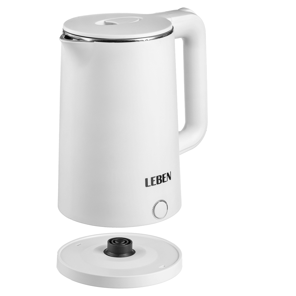 Электрический чайник LEBEN – надёжный и простой в использовании помощник на любой кухне. Объём 1,8 л – как раз для семьи или нескольких чашек подряд, а мощность 1850 Вт позволяет вскипятить воду быстро, буквально за пару минут. Корпус выполнен из прочного белого пластика, выглядит аккуратно, легко моется и не нагревается снаружи. Особенность – скрытый нагревательный элемент: дно гладкое, без накипи и загрязнений, что упрощает уход и продлевает срок службы. Чайник поворачивается на 360°. Есть световой индикатор работы и автоматическое отключение при закипании, что безопасно и удобно. Идеален для ежедневного использования: компактный, функциональный, стильный.