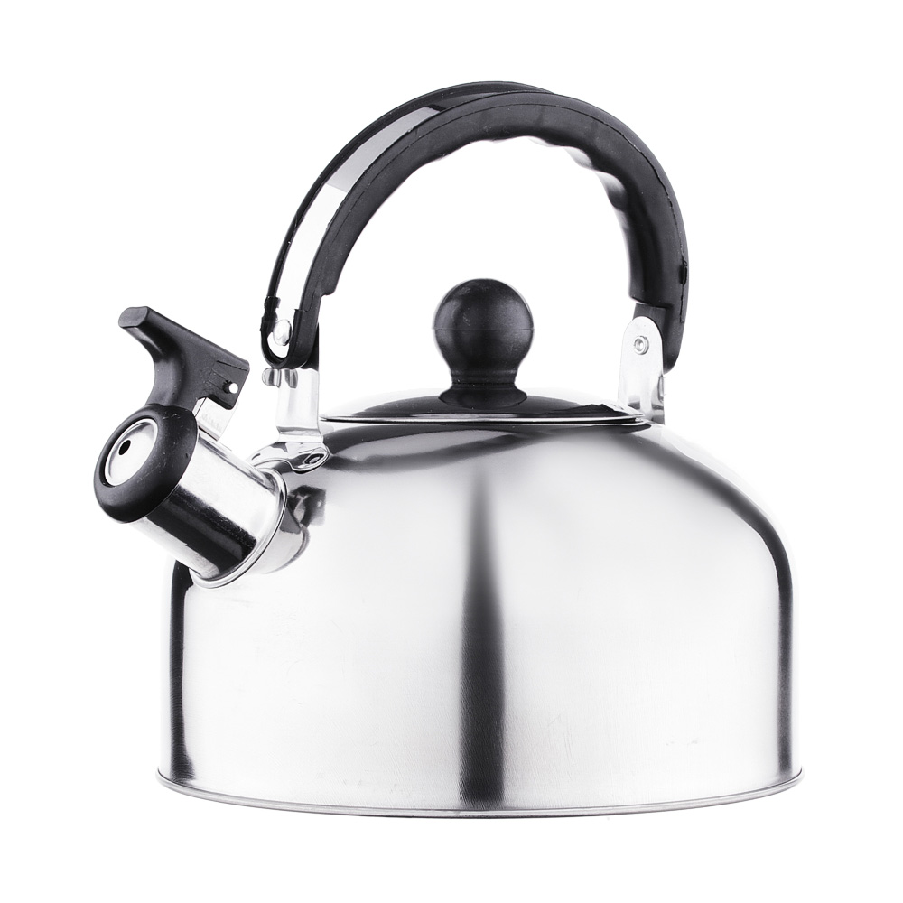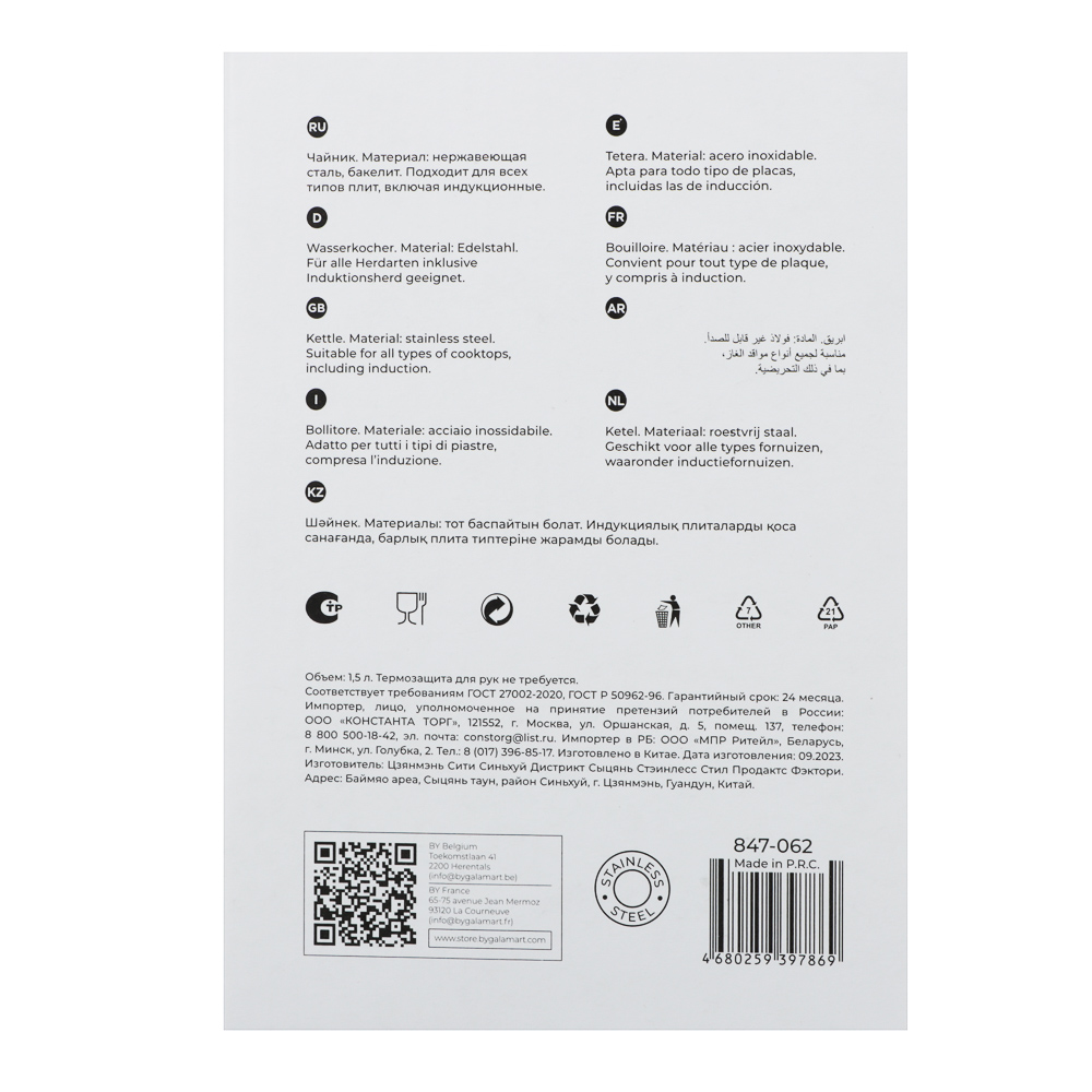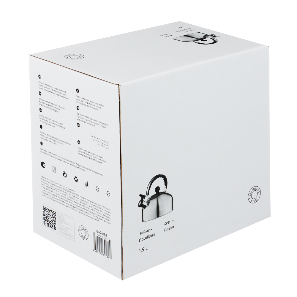 Чайник объемом 1,5 л изготовлен из нержавеющей стали, оснащен несъемным свистком и бакелитовой ручкой, с капсульным дном, подходит для использования на всех типах плит, включая индукцию.