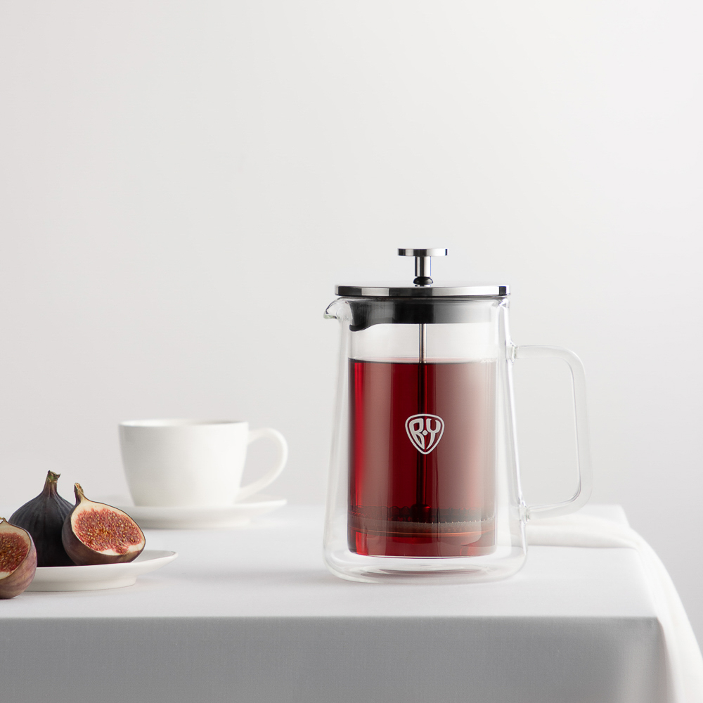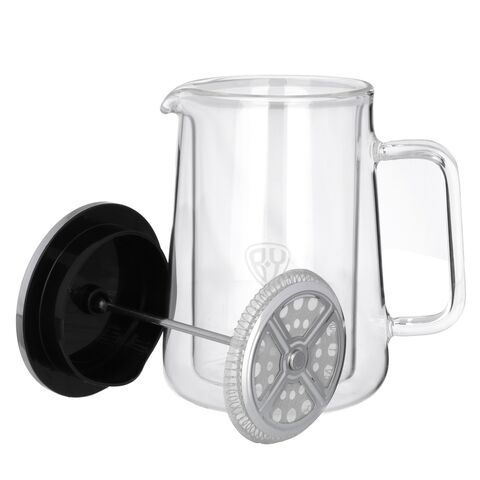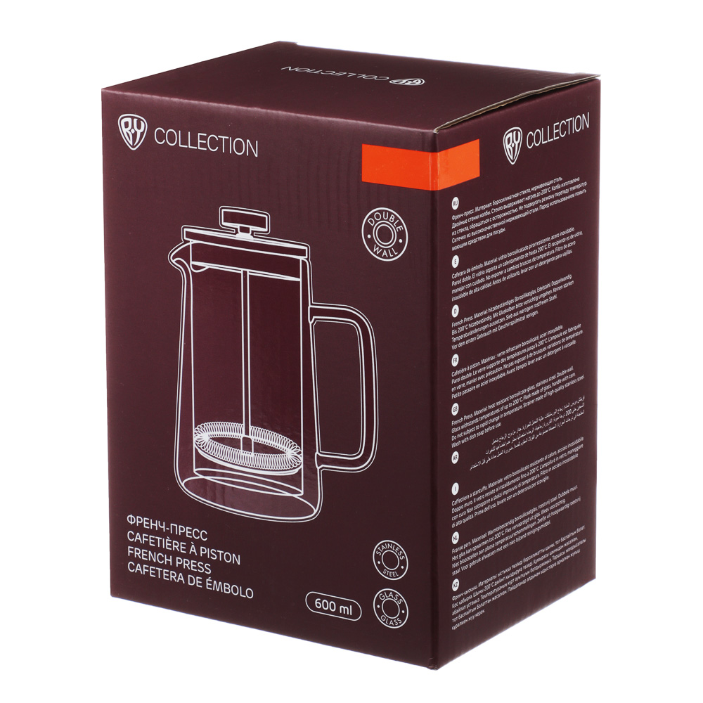Френч-пресс из жаропрочного стекла с двойными стенками, который позволяет поддерживать температуру напитка гораздо дольше, а также предотвращает ожоги рук. Втулка из нержавеющей стали долговечная и надежная, не искажает вкус напитка.