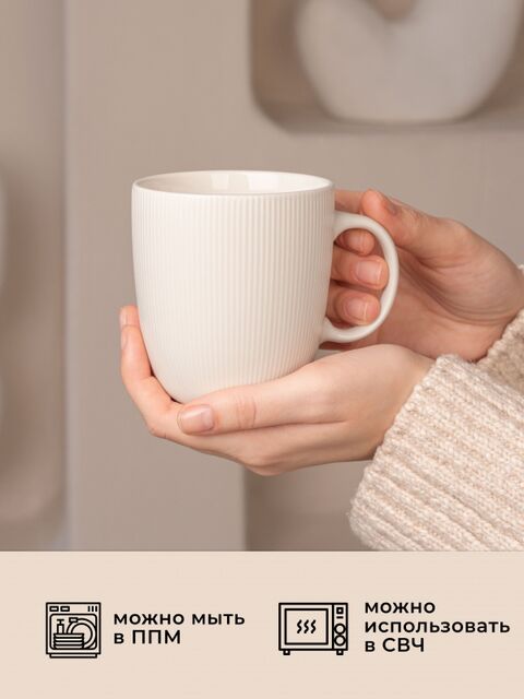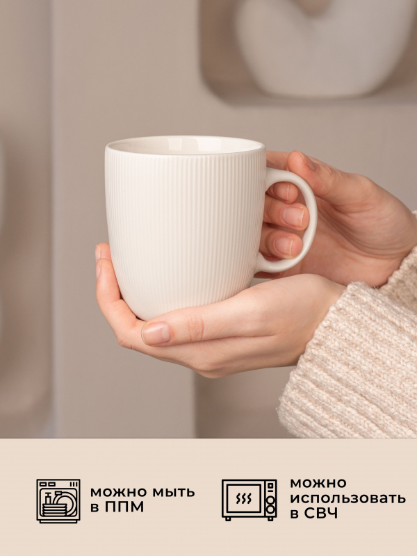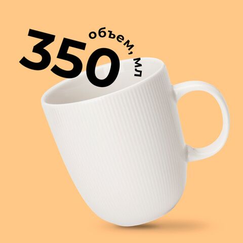 Кружка фарфоровая белая стандартного объема с интересным рельефным дизайном.