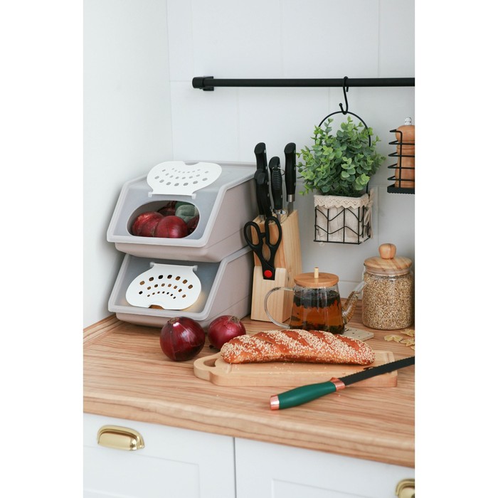 Контейнер для хранения овощей предназначен для длительного хранения овощей. Благодаря системе вентиляции овощи в ящике долго остаются свежими, полезными, а также это позволяет избежать их гниения и появления плесени. Поставьте контейнеры друг на друга, чтобы сэкономить место на кухне. Компактный ящик для хранения позволяет поместить его на кухню, балкон или дачу.