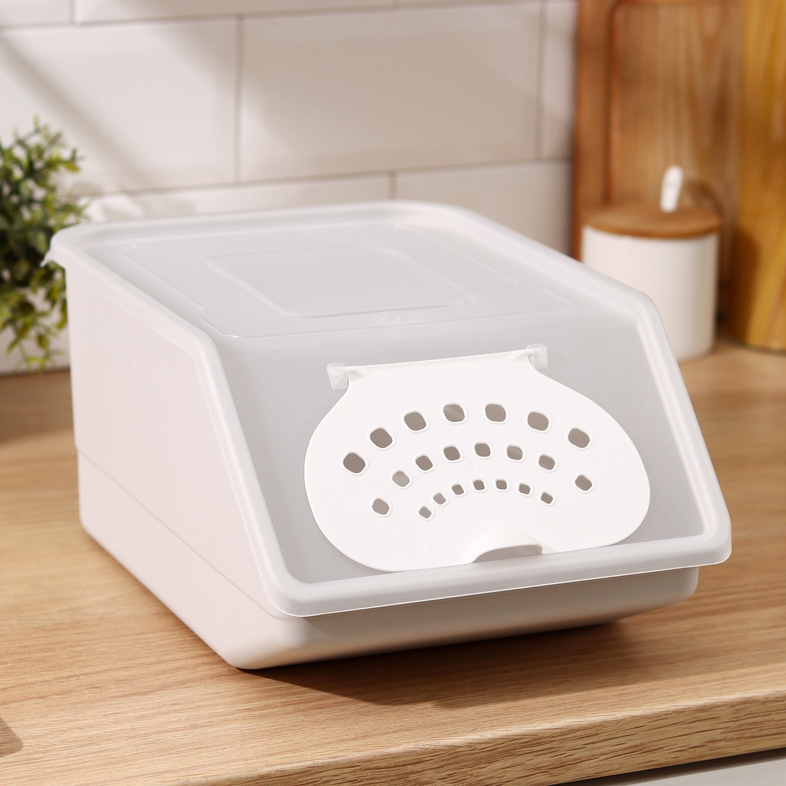 Контейнер для хранения овощей предназначен для длительного хранения овощей. Благодаря системе вентиляции овощи в ящике долго остаются свежими, полезными, а также это позволяет избежать их гниения и появления плесени. Поставьте контейнеры друг на друга, чтобы сэкономить место на кухне. Компактный ящик для хранения позволяет поместить его на кухню, балкон, лоджию или дачу.