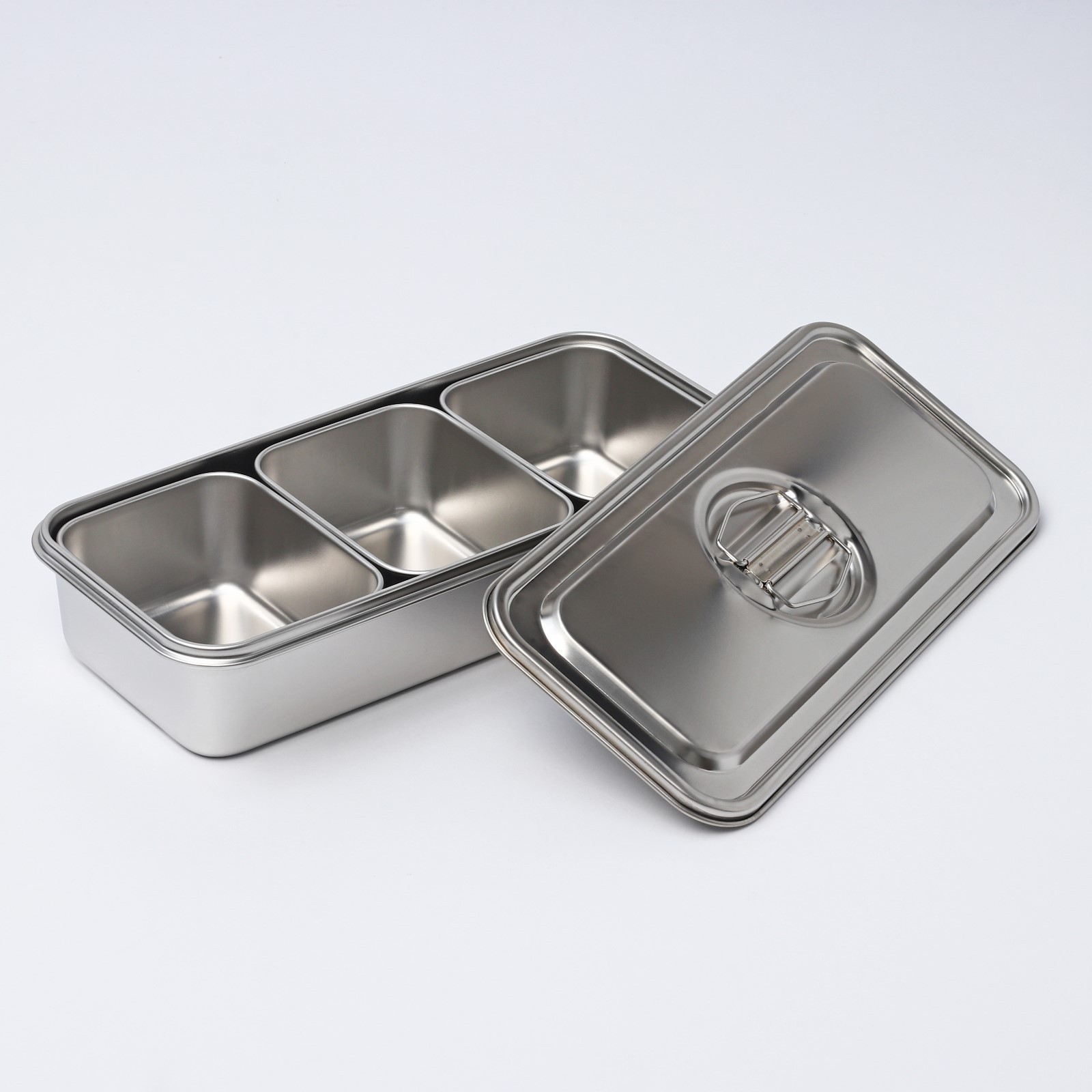 Удобный и практичный контейнер изготовлен из качественной нержавеющей стали. Контейнер имеет 3 секции и предназначен для хранения готовых и сырых продуктов.