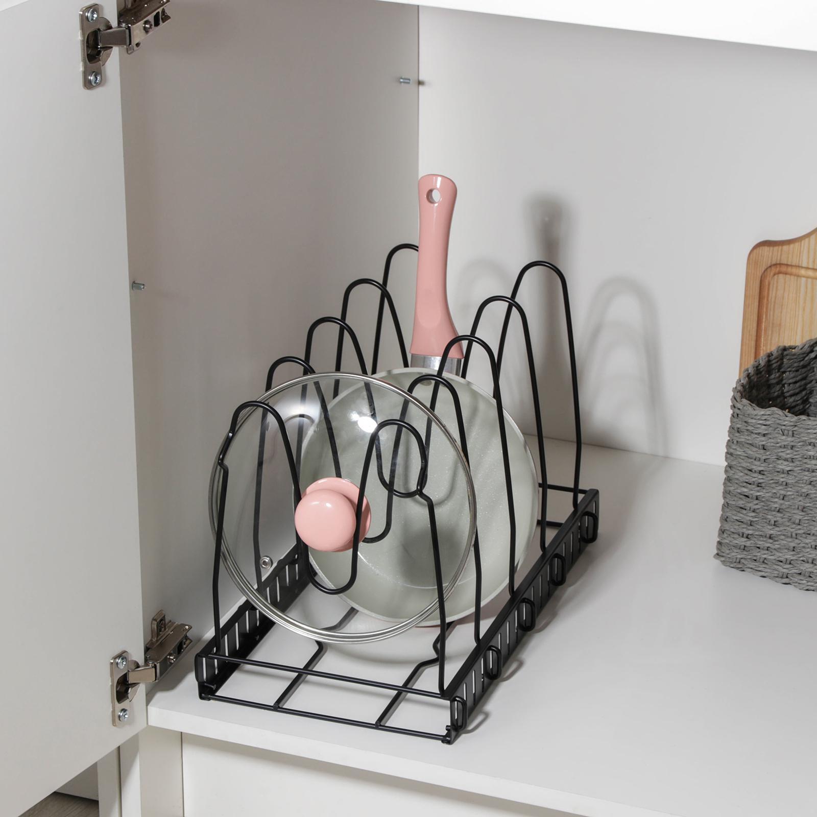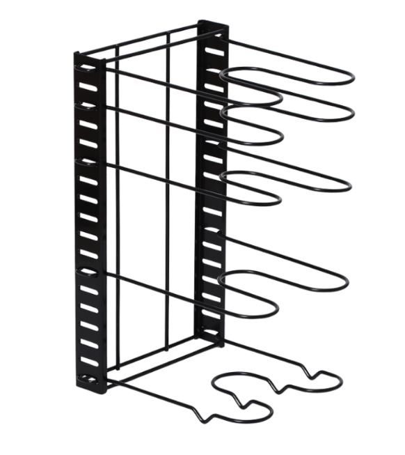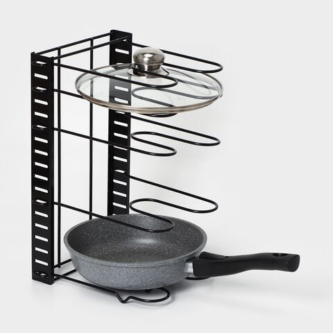 Удобная подставка предназначена для экономии места на кухне, а именно компактного хранения сковородок и крышек в одном месте.