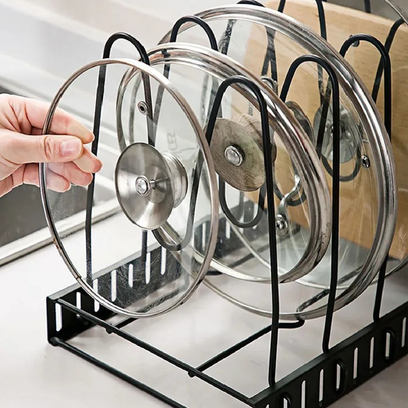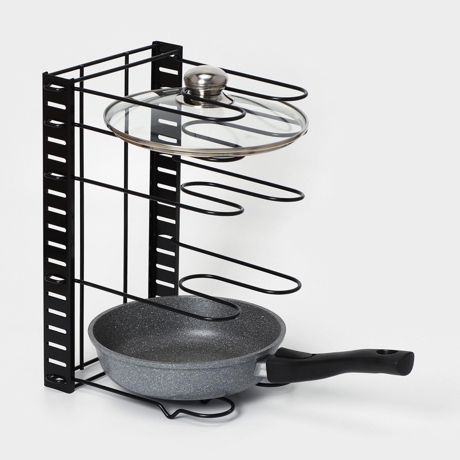 Держатель можно использовать как для хранения, так и для сушки сковородок и крышек.