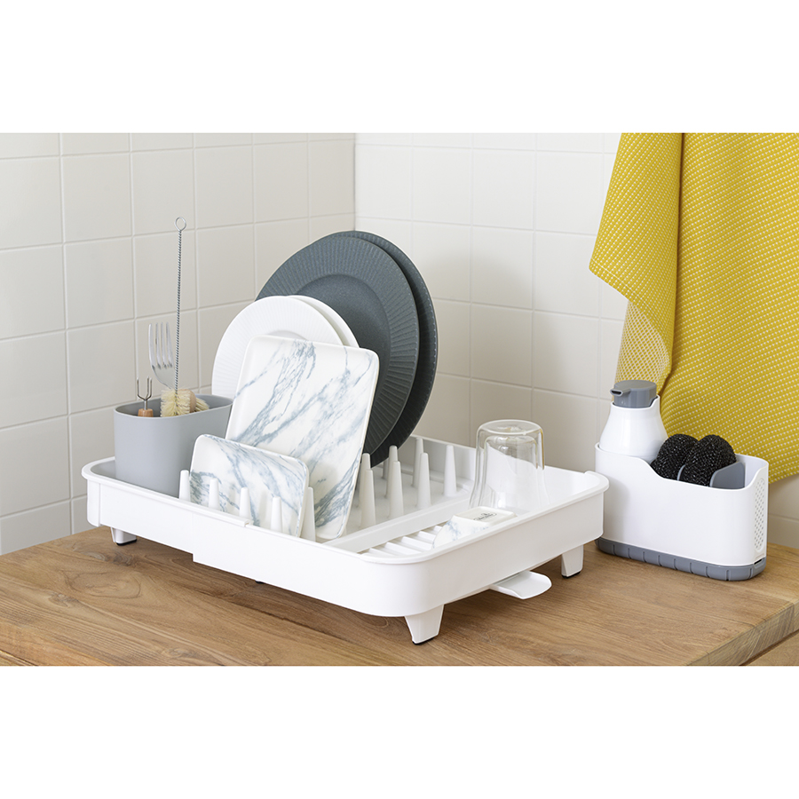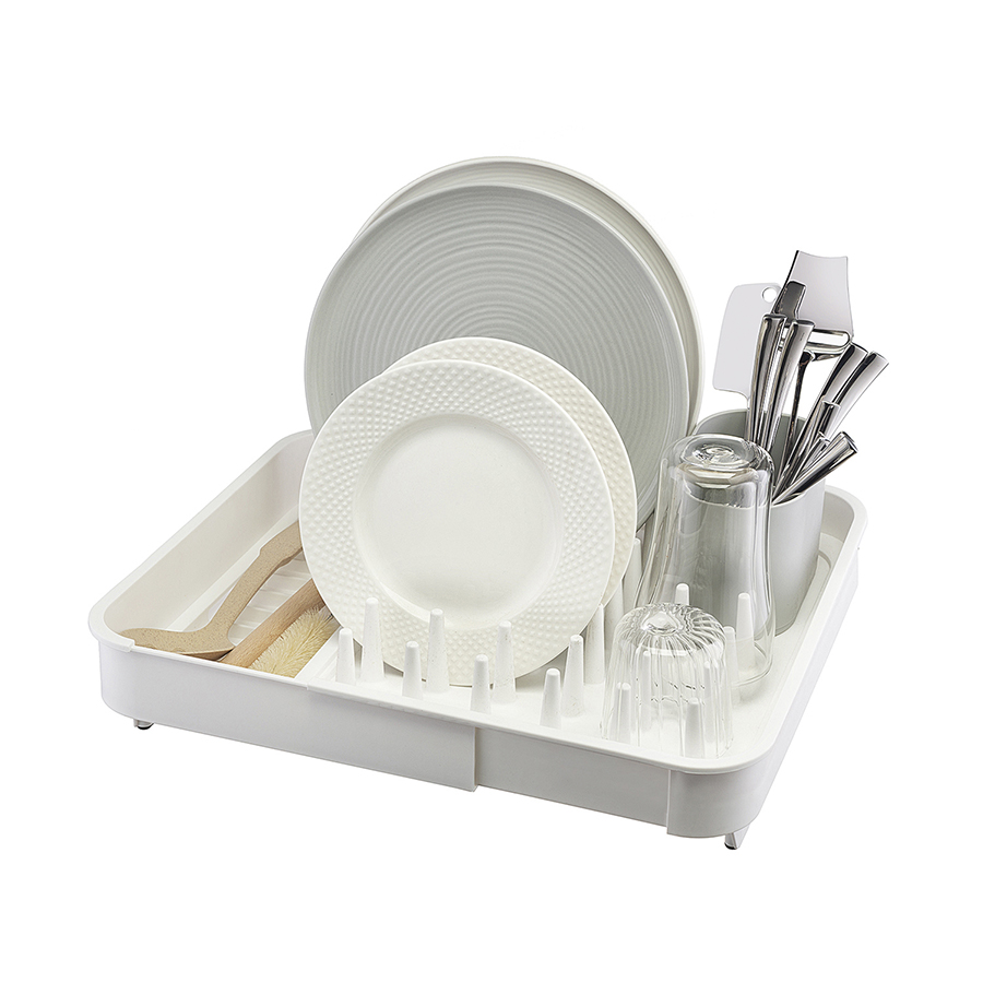 Пластиковая сушилка Jarl поможет компактно разместить посуду и столовые приборы после мытья, заняв минимум места на столешнице. Благодаря практичному и устойчивому к износу материалу изделие легко очищается от загрязнений, не боится воздействия влаги и механических повреждений. Конструкция отличается лаконичным дизайном, что позволяет вписать ее в любой современный интерьер.