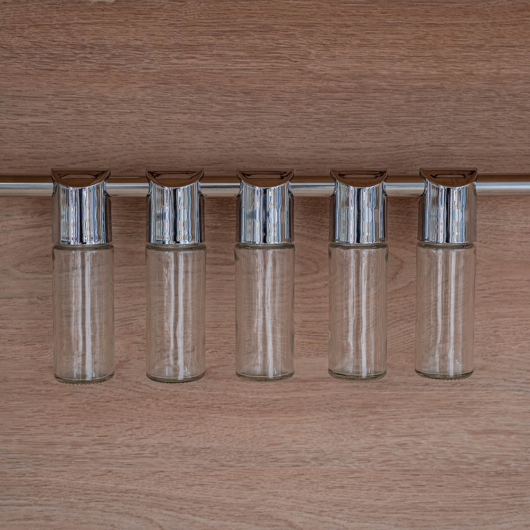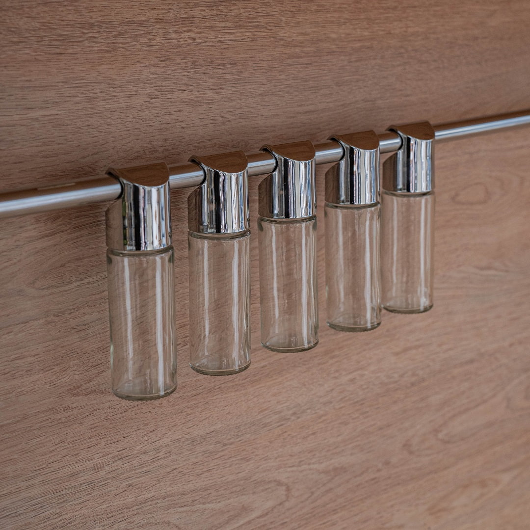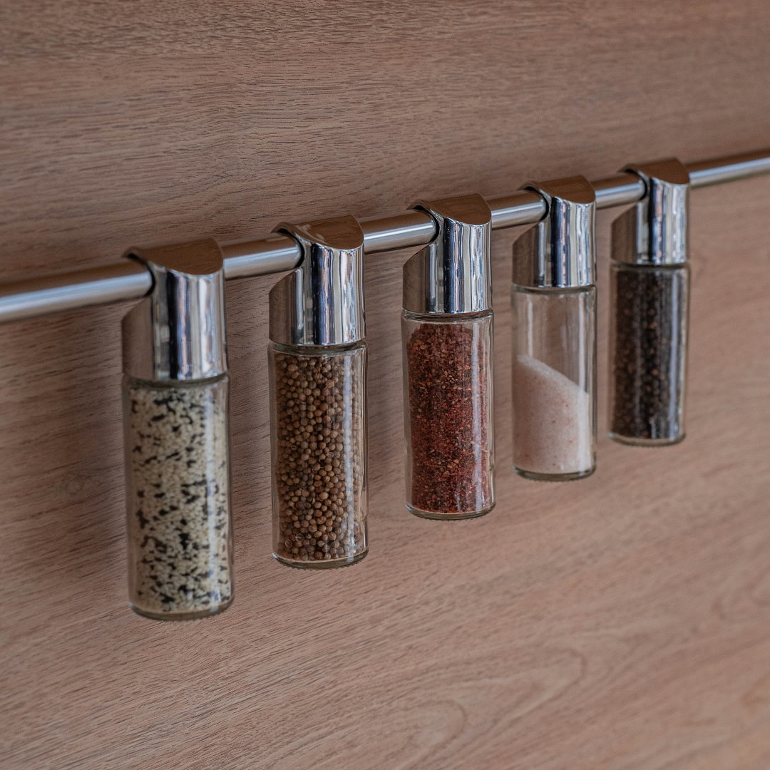 Удобный и практичный набор из пяти банок для специй. Можно поставить на стол, а затем вновь повесить на рейлинг. Банки выполнены из стекла, поэтому видно, что в них находится. Нужные специи всегда на виду и в легком доступе.