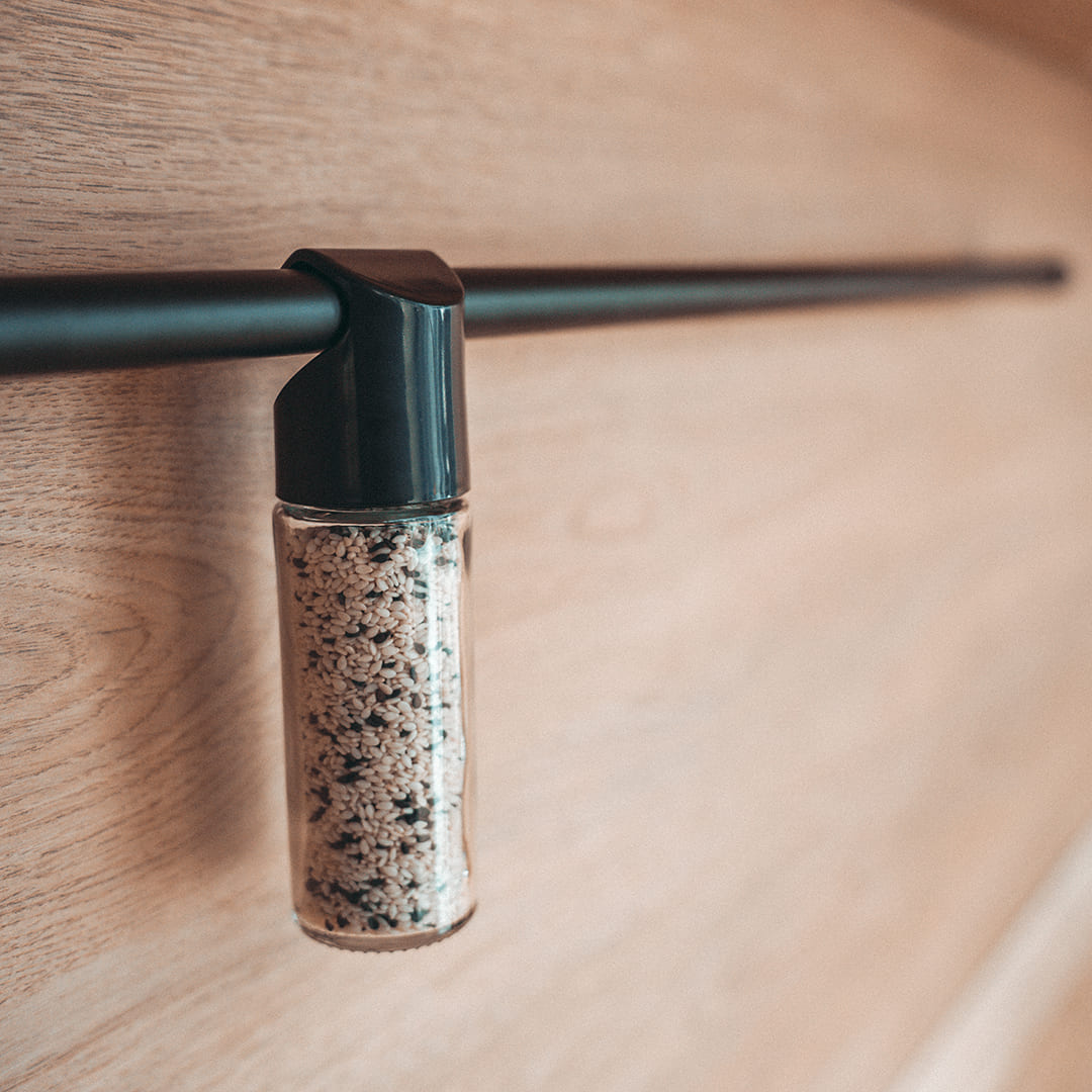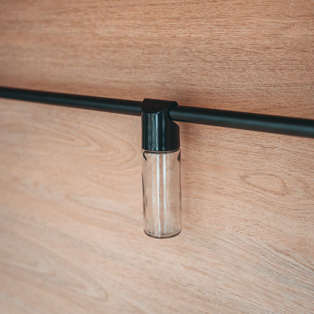 Стеклянная навесная баночка для хранения специй, оснащена специальной крышкой, благодаря которой баночка легко крепится на трубе рейлинга диаметром 16 мм.