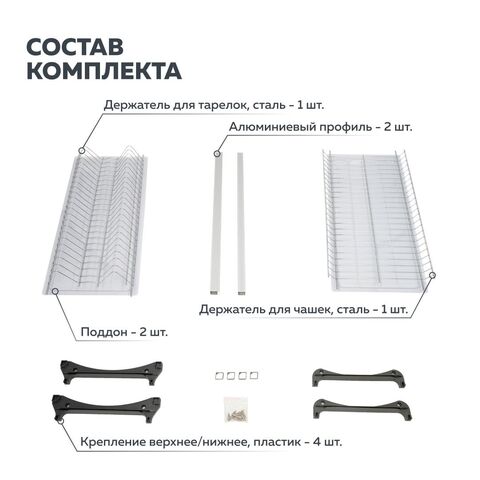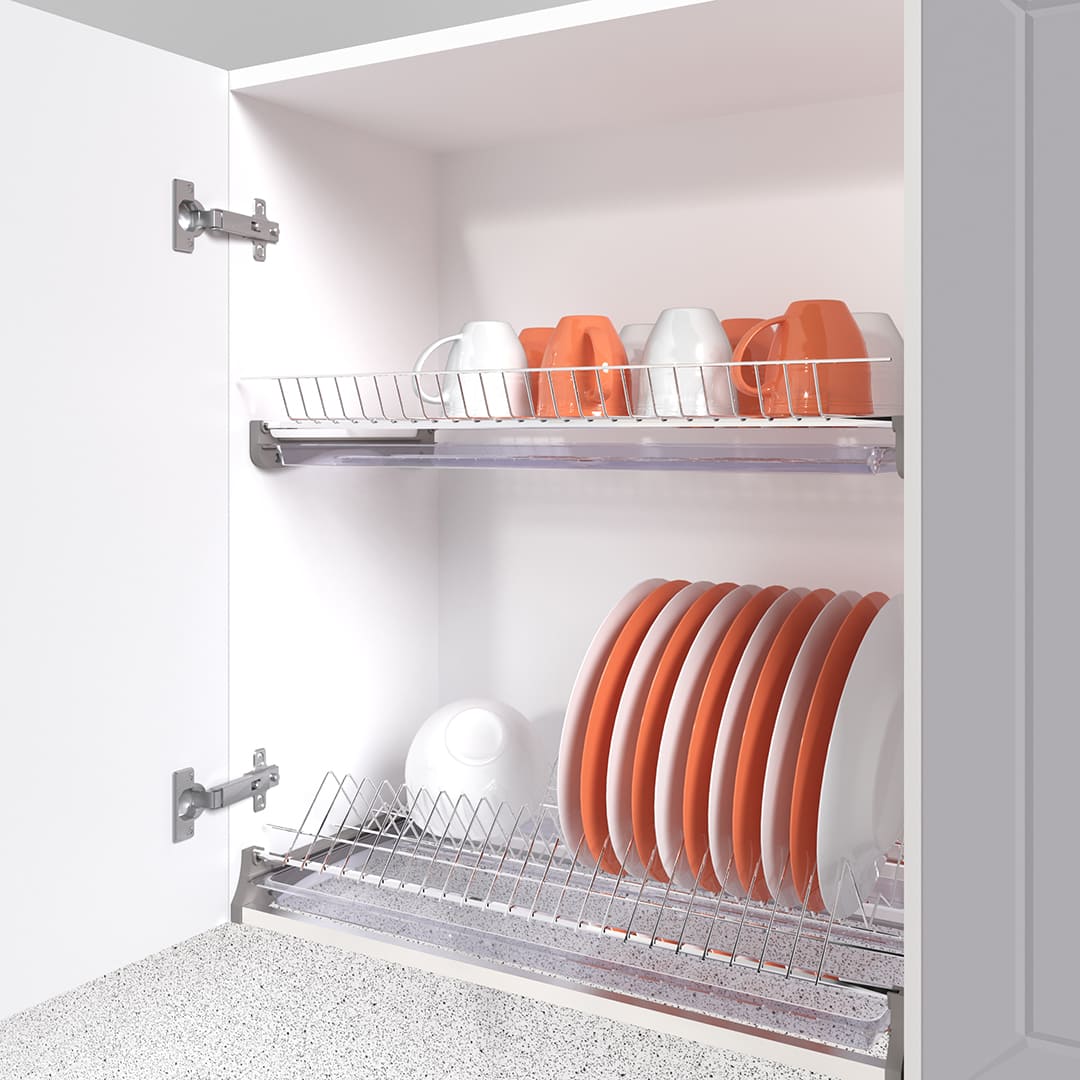 Двухуровневая встраиваемая сушилка для посуды. Предназначена для монтажа в верхний шкафчик кухонного гарнитура. В комплект входят: держатель тарелок и полка для сушки чашек и бокалов, два поддона-накопителя для стекающей воды, крепежные элементы и два алюминиевых профиля, позволяющих осуществлять монтаж изделия в шкафчики без дна, сохраняя жесткость конструкции. Допустимая нагрузка на каждый уровень до 12 кг.