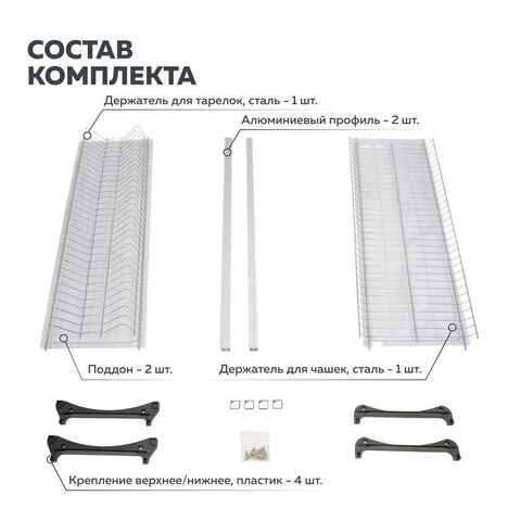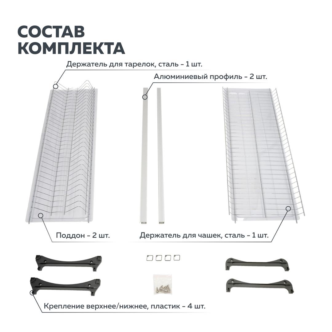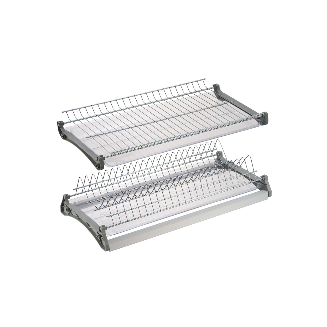Двухуровневая встраиваемая сушилка для посуды. Предназначена для монтажа в верхний шкафчик кухонного гарнитура. В комплект входят: держатель тарелок и полка для сушки чашек и бокалов, два поддона-накопителя для стекающей воды, крепежные элементы и два алюминиевых профиля, позволяющих осуществлять монтаж изделия в шкафчики без дна, сохраняя жесткость конструкции. Допустимая нагрузка на каждый уровень до 12 кг.