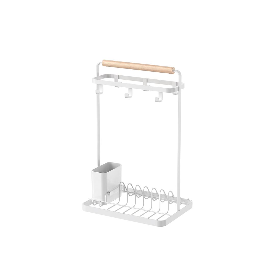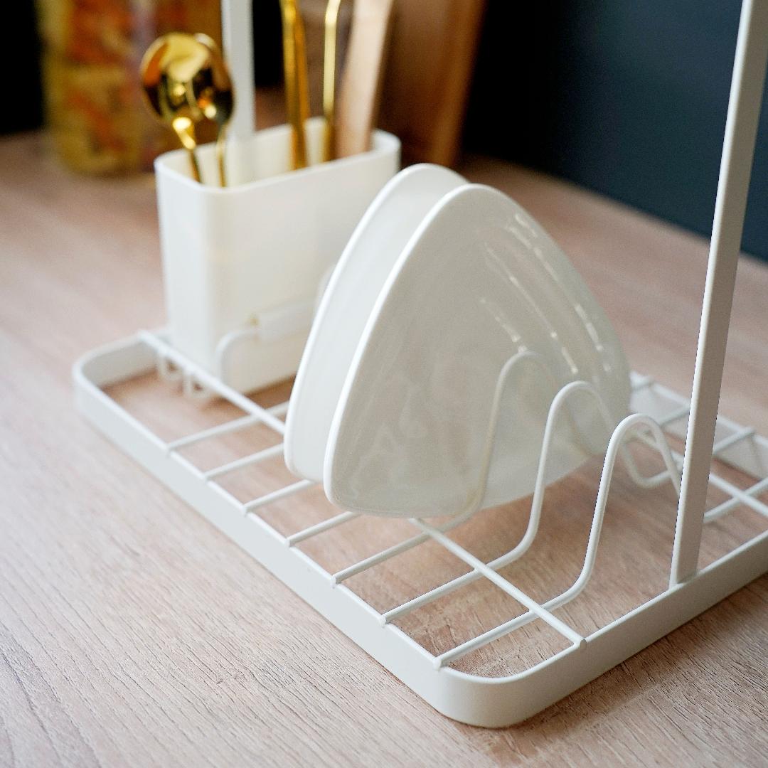 Компактная многофункциональная сушилка для посуды предназначена для хранения плоских тарелок, чашек и столовых приборов на кухне. В комплект входит металлическая сушка с деревянной ручкой и съемный пластиковый стакан. Двухъярусная конструкция позволяет организовать порядок на кухне и экономить при этом место. Подставка для посуды сделана из металла, покрытого порошковой краской с антикоррозийными свойствами. Это обеспечит долгий срок службы изделия даже в местах повышенной влажности, например, около раковины. Эстетичный минималистичный дизайн гармонично впишется в любой современный интерьер. Цвет: белый матовый.