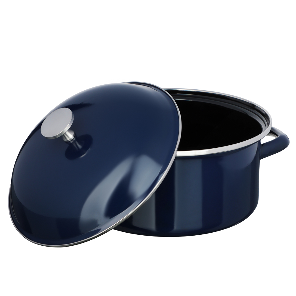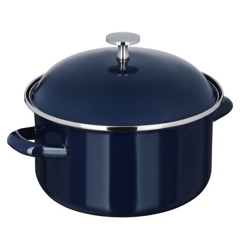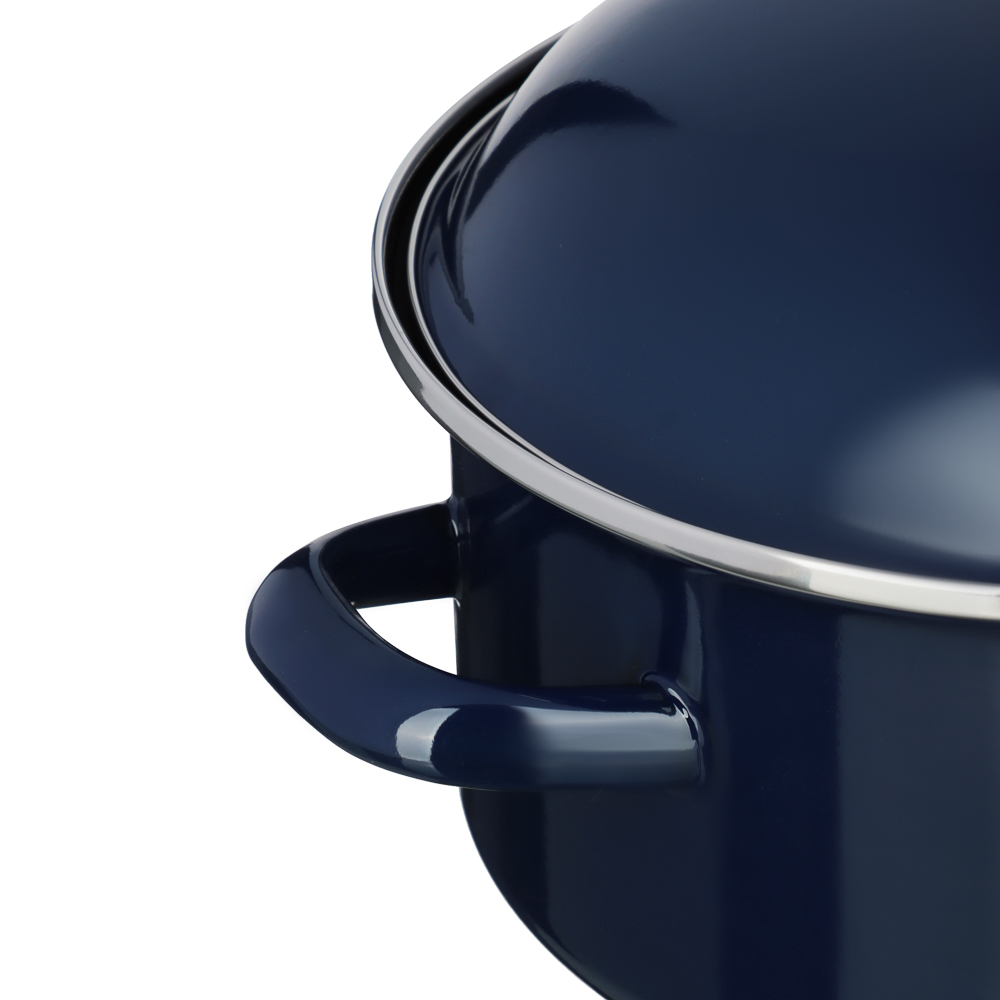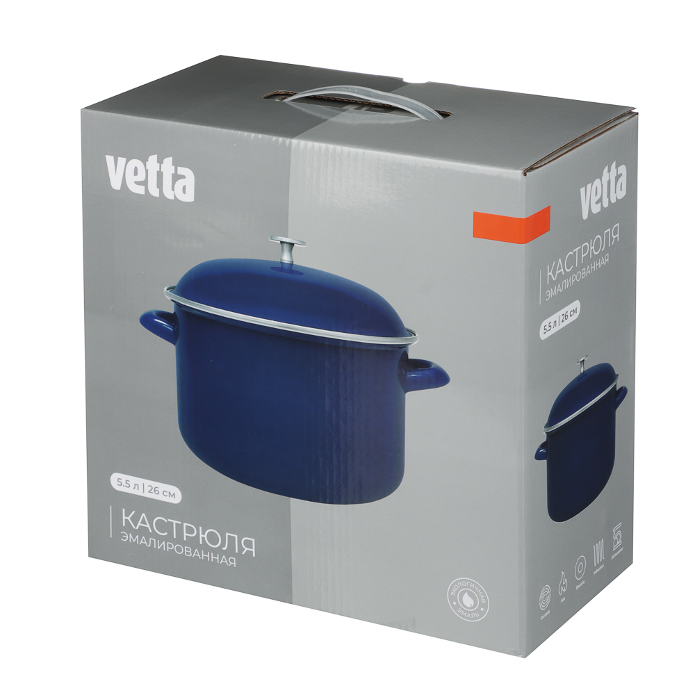 Эмалированная кастрюля VETTA «Ноэми», 26 см, объем 5,5 л – это качественная посуда из нержавеющей стали с экологичным эмалированным покрытием. Имеет стильный строгий дизайн в темно-синем цвете и будет актуально смотреться в любом интерьерном стиле. Подходит для приготовления блюд для большой семьи. Идеальна для варки супов, овощей, полуфабрикатов, а также компотов и киселей. Кастрюля выдерживает длительный нагрев, не деформируется, не выделяет вредных веществ и подходит для длительного хранения готовой еды. Предназначена для всех типов плит, включая индукционные.
