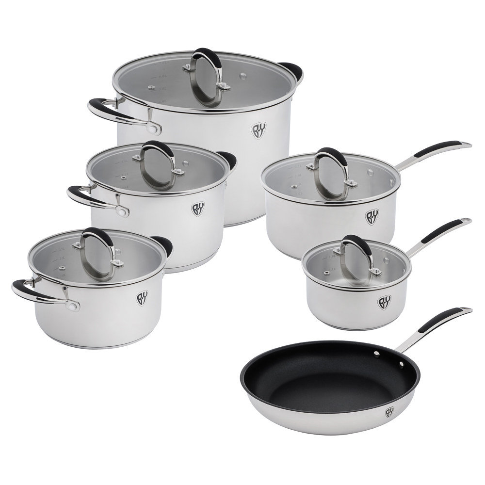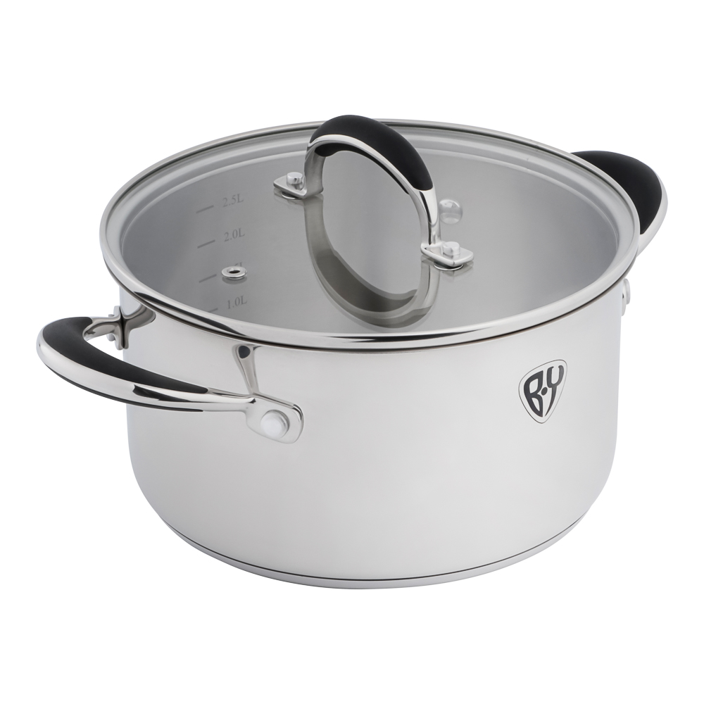 BY COLLECTION Harp представляет стильный набор кухонной посуды из 11 предметов, который станет незаменимым помощником на любой кухне. Комплект из высококачественной нержавеющей стали включает три кастрюли разного объема (7,5 л, 5 л и 3 л) с крышками, два удобных ковша (3 л и 1,5 л) с крышками и практичную сковороду диаметром 24 см. Особенность набора - эргономичные силиконовые ручки, которые не нагреваются во время готовки, обеспечивая безопасность и комфорт. Многослойное термораспределяющее дно гарантирует быстрый и равномерный нагрев, экономя ваше время и энергию. Посуда подходит для всех типов плит, включая индукционные, и сохраняет безупречный вид благодаря зеркальной полировке поверхности. Лаконичный дизайн в сочетании с продуманной функциональностью делает этот набор идеальным выбором для современной кухни, где важны и эстетика, и практичность.