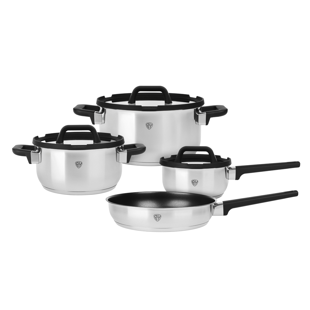 Набор кухонной посуды BY COLLECTION «Inta» из 7 предметов включает все необходимое для приготовления первых и вторых блюд, а также каш и соусов на домашней кухне. Состав комплекта: кастрюли 5 л; 3 л; ковш 1,5 л; сковорода 24 см и 3 крышки. Все предметы изготовлены из высококачественной нержавеющей стали марки AISI-304, обладающей высокой коррозионной стойкостью и прочностью. Кастрюли и сковорода имеют толстое капсульное дно для быстрого нагрева и равномерного приготовления пищи. Бакелитовые ручки не нагреваются, а крышки оснащены сливными отверстиями для удаления жидкостей при варке гарниров и овощей. Шкала объема на внутренних стенках позволяет точно дозировать количество ингредиентов. Сковорода с безопасным антипригарным покрытием позволяет готовить полезные блюда с минимальным количеством масла, а продукты не пригорают и не прилипают. Современный дизайн с хромированной отделкой и эргономичными ручками выигрышно смотрится в любом интерьерном стиле. Набор посуды подходит для всех типо
