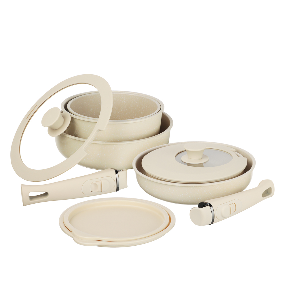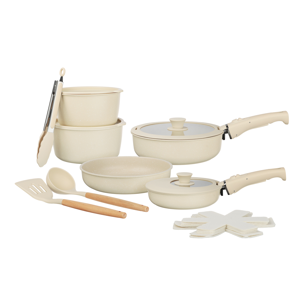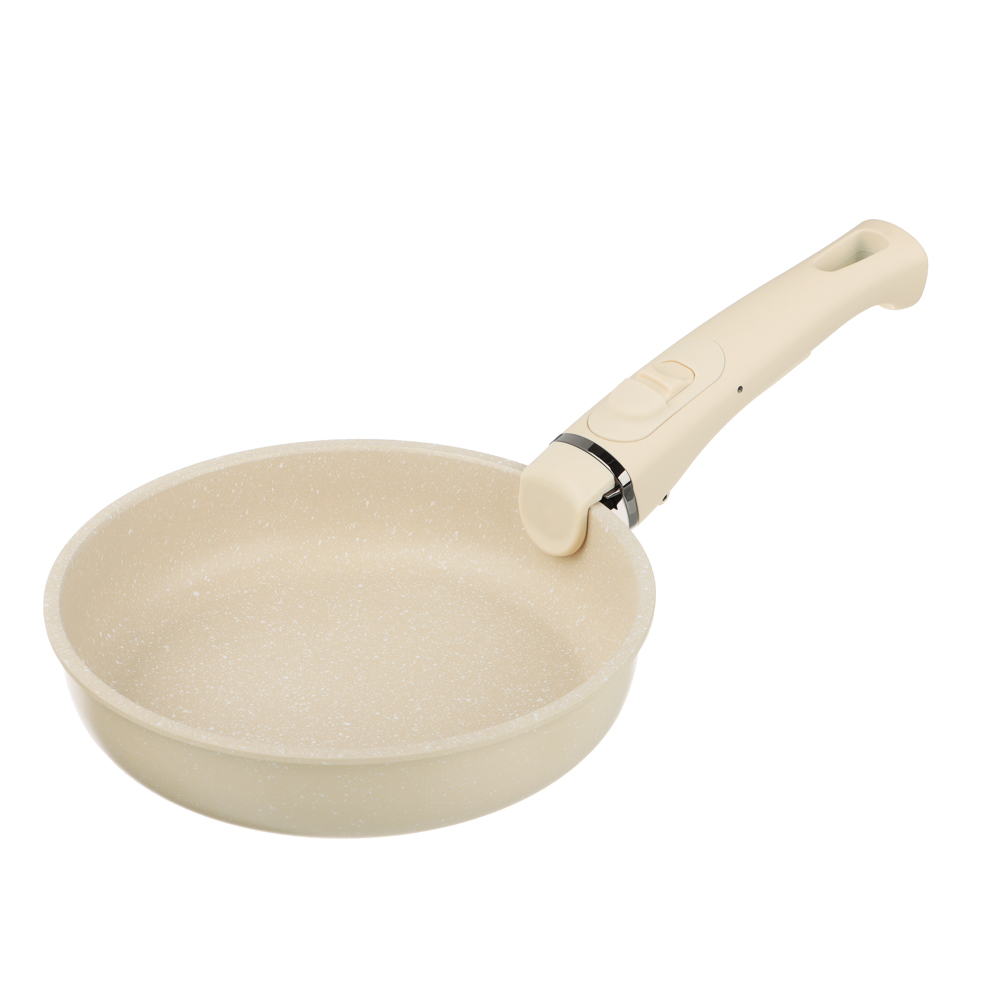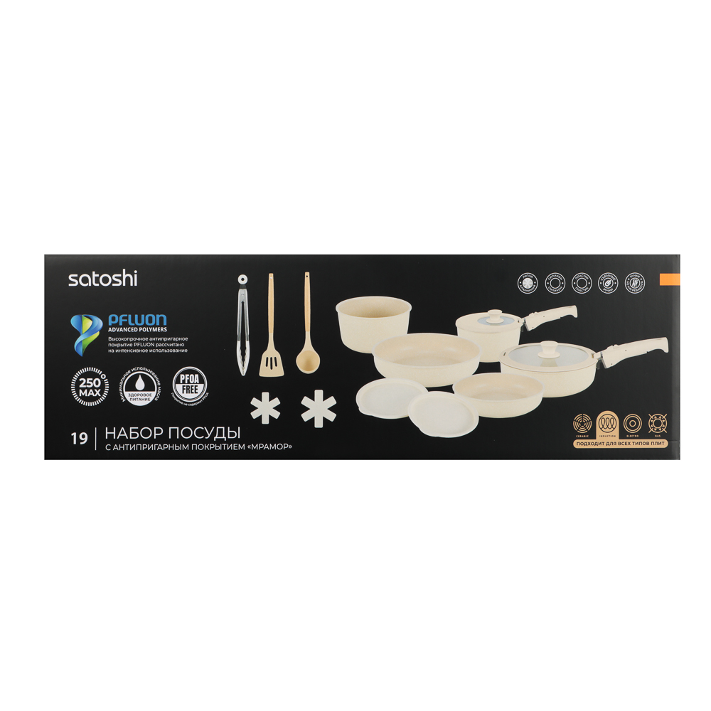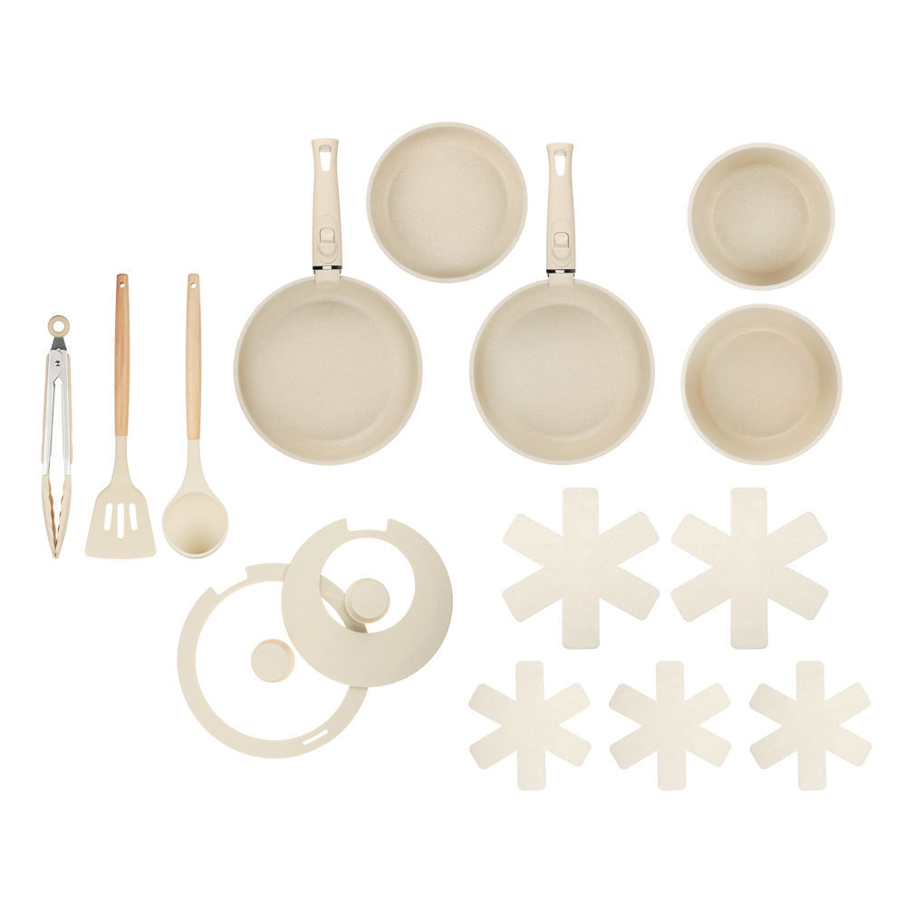Набор посуды SATOSHI Бланко – современное решение для кухни, сочетающее стильный дизайн и высокое качество. В комплекте 19 предметов: три сковороды (20х4,8 см, 24х5,3 см, 24х7 см); кастрюля 20х10 см, 2,8 л; ковш 18х9,5 см, 2,2 л; съёмные ручки; универсальные крышки; пластиковые крышки для хранения (20 и 18 см); протекторы из войлока, а также кухонные аксессуары из силикона: половник, лопатка, щипцы. Посуда выполнена из прочного литого алюминия с антипригарным покрытием «мрамор» на водной основе, не содержащим PFOA. Безопасное и долговечное покрытие выдерживает до 9000 циклов истирания. Подходит для использования в посудомоечной машине, а также совместима со всеми типами плит. Съёмные ручки позволяют использовать посуду как на плите, так и в духовке, а защитные протекторы предотвращают повреждение поверхности при хранении. Компактный и функциональный, этот набор станет настоящим помощником на кухне – когда каждое блюдо готовится с удовольствием!