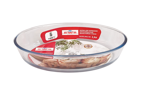 Форма для запекания JEWEL 2,4л из жаропрочного стекла, овальная. Стильное дополнение для вашей кухни. Посуда предназначена для запекания в духовке до 250 градусов. Не рекомендуется ставить в духовой шкаф сразу после холодильника. (Без крышки) Можно мыть в посудомоечной машине и использовать в микроволновой печи.