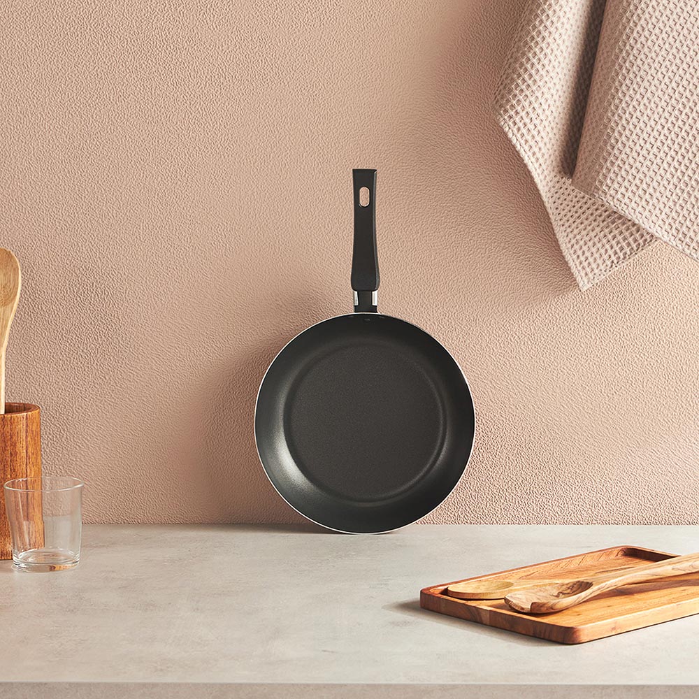 Сковорода с антипригарным покрытием диаметром 24 см оптимальна для жарки без масла, а также для тушения и отличается высокой скоростью нагрева. Пологие спуски стенок способствуют равномерному прогреву продуктов в процессе приготовления и облегчают перемешивание. Пластиковая ручка имеет надежное крепление и не скользит. Сковорода подходит для всех типов плит, кроме индукции.