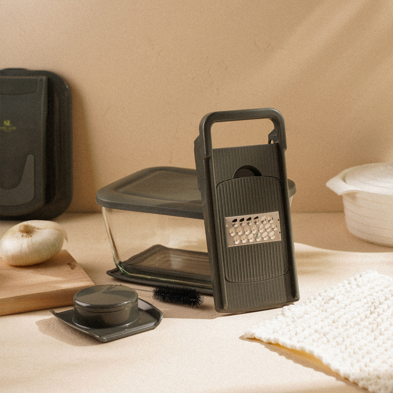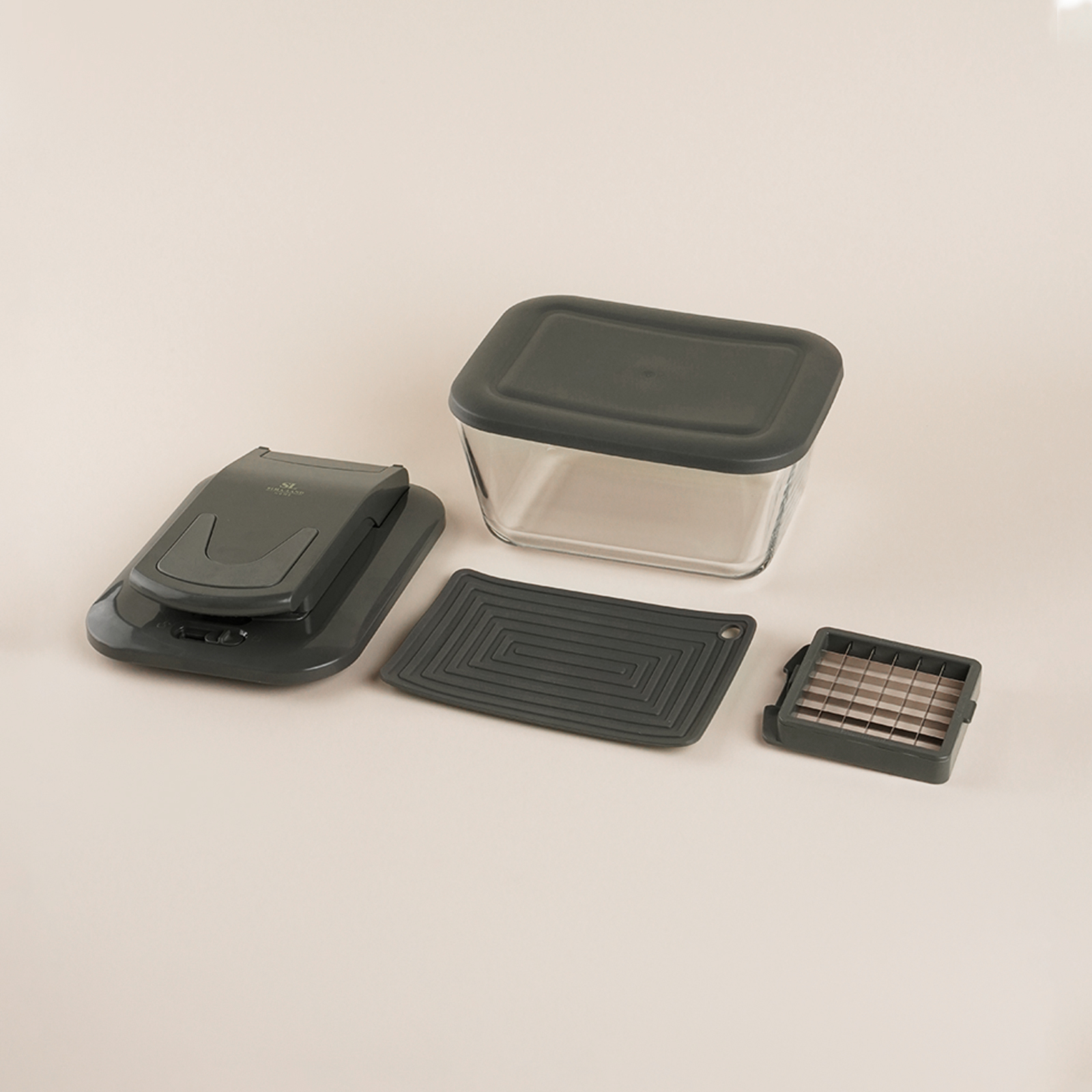 - Удобство использования: контейнер для нарезки и встроенный дуршлаг позволяют легко мыть и сушить нарезанные овощи прямо в процессе приготовления;