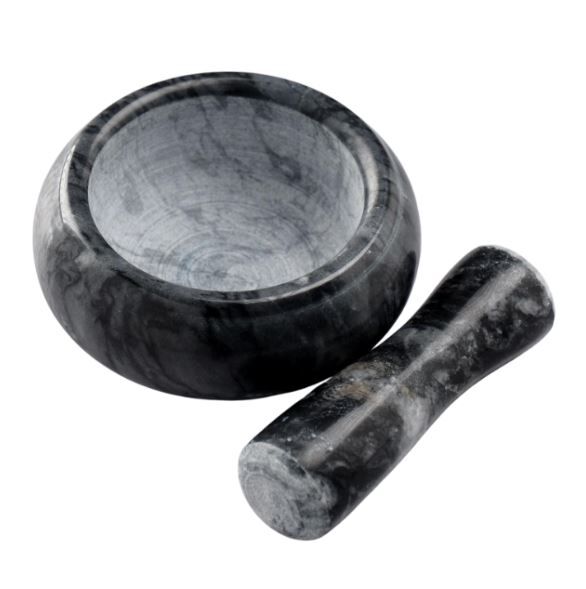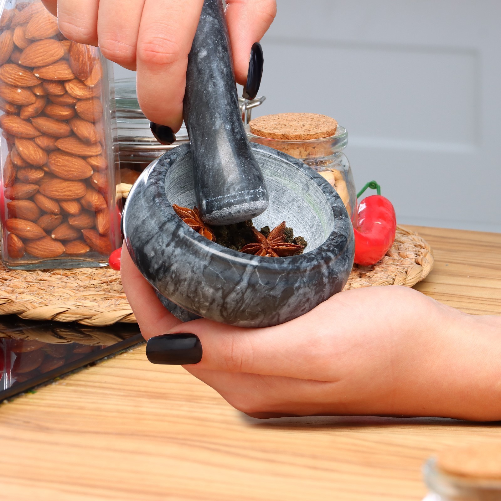 Мини-ступка из мрамора — для тех, кто готовит с акцентом на детали. Её компактный объём и широкая чаша делают её удобной для быстрого помола небольших порций: свежемолотый перец к стейку, щепотка растёртого тмина в суп или капля пасты из имбиря и чеснока для маринада. Серый мрамор выглядит лаконично, не отвлекая от сути — точной работы с ароматами.