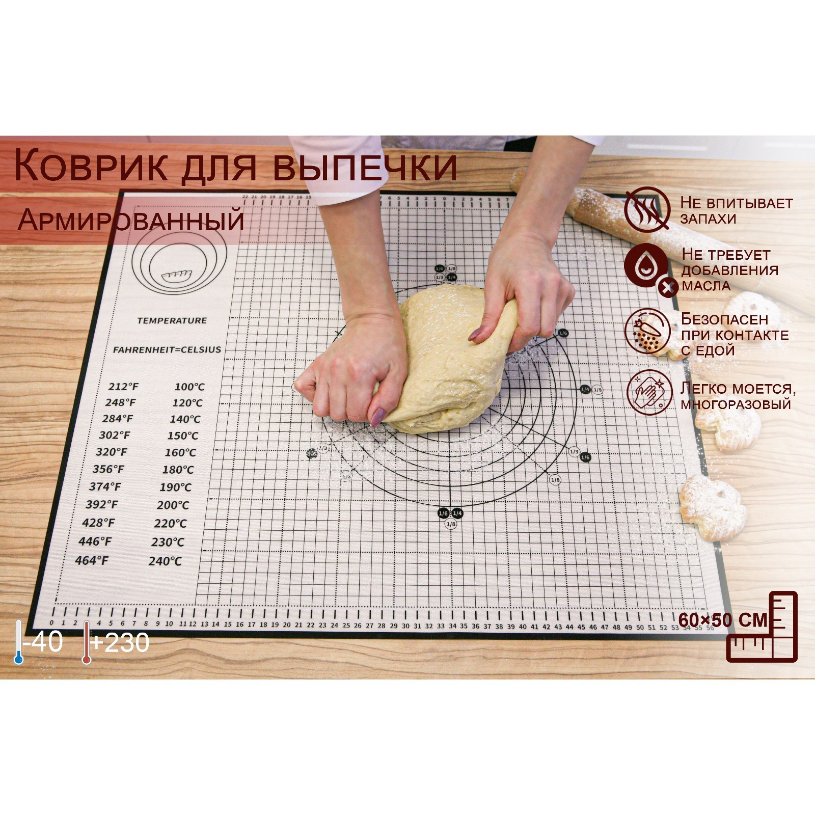 Для раскатки теста. Используйте обе стороны. Оставшуюся муку легко удалить влажной тряпкой или смыть водой. Для разделения теста используйте пластмассовые шпатели и формы для моделирования, они не повредят поверхности.