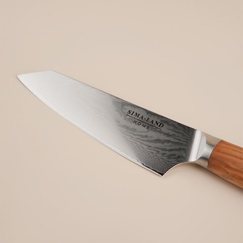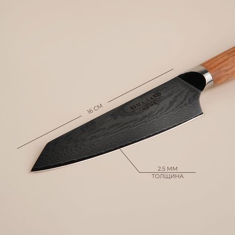 Лезвие длиной 16 см изготовлено из прочной дамасской стали, что обеспечивает не только исключительную остроту, но и долговечность ножа. Материал устойчив к коррозии, что гарантирует продолжительный срок службы даже при ежедневном использовании. Эргономичная ручка из дерева удобно ложится в руку, обеспечивая уверенное управление и снижая усталость во время работы.