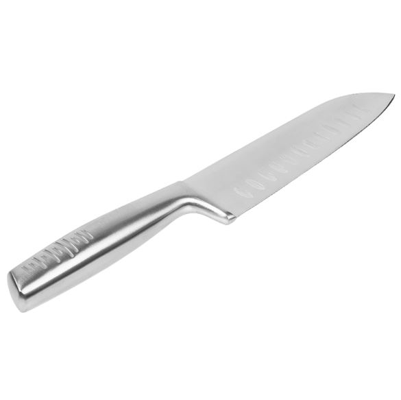 Нож Сантоку Томодачи с лезвием 18 см. Универсальный нож для нарезки продуктов соломкой или кубиками, разделки мяса. Грантоны (воздушные карманы) вдоль режущей кромки предназначены для уменьшения прилипания продуктов к ножу. Лезвие изготовлено из высококачественной особопрочной стали, что обеспечивает исключительную остроту. Эргономичная и лёгкая рукоять со специальнами канавками для удобного и крепкого захвата.