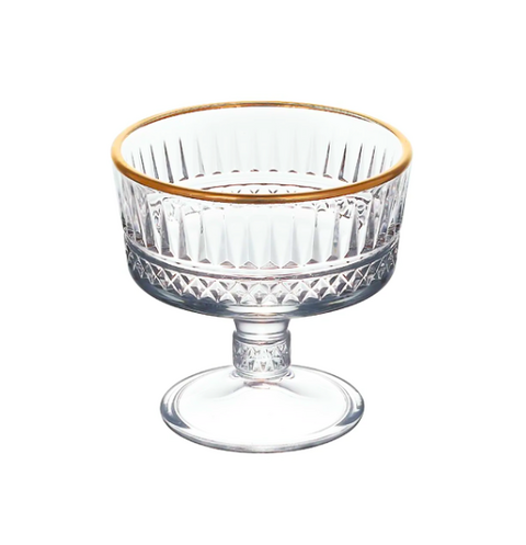 Стеклянная креманка на ножке украшена интересным рельефным декором. Станет прекрасным украшением праздничного стола. Подходит для сервироки десертов, закусок.