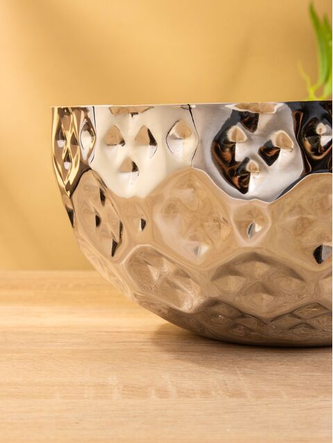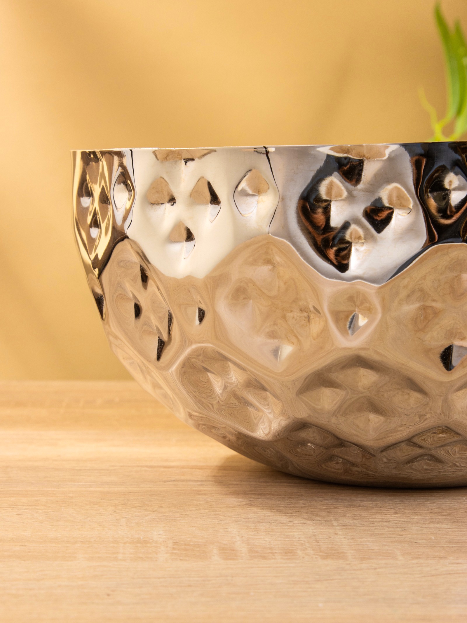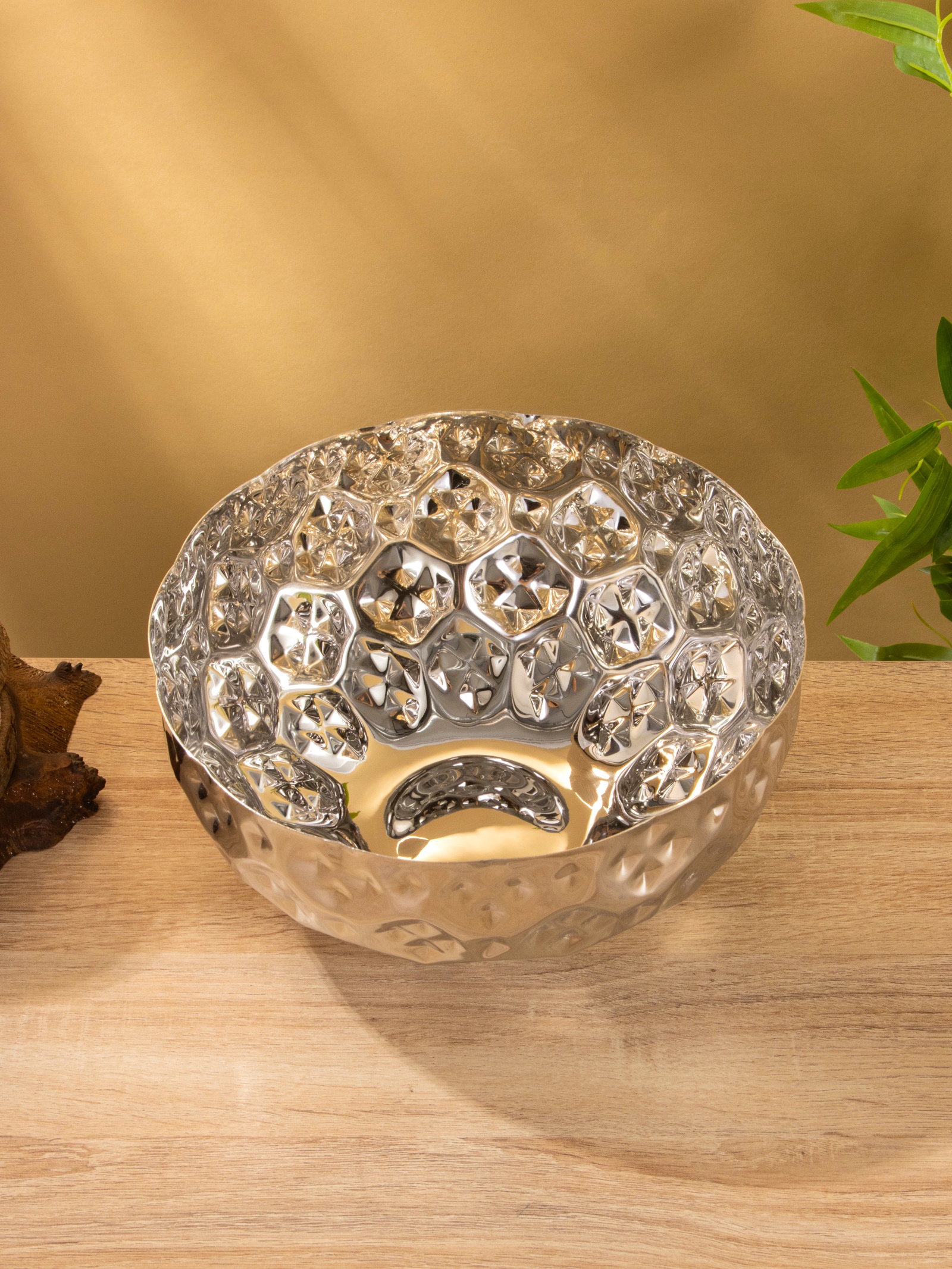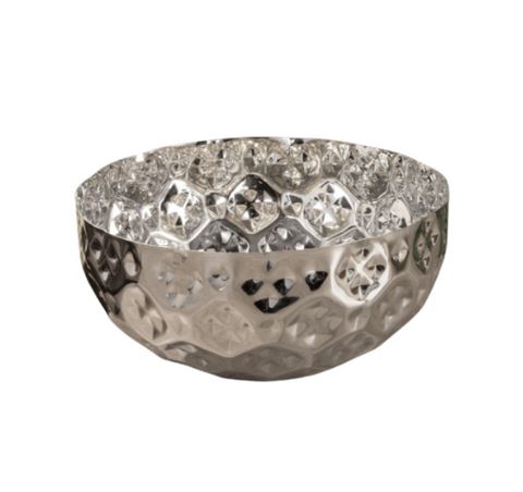 Гранёная миска из нержавеющей стали. Вместимость 3,5 литра, диаметр 25 см. Классический серебристый цвет с рельефной поверхностью. Универсальная посуда для кухни и сервировки.