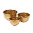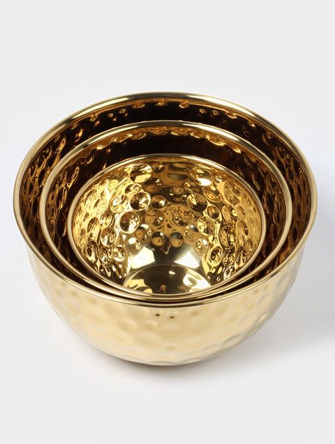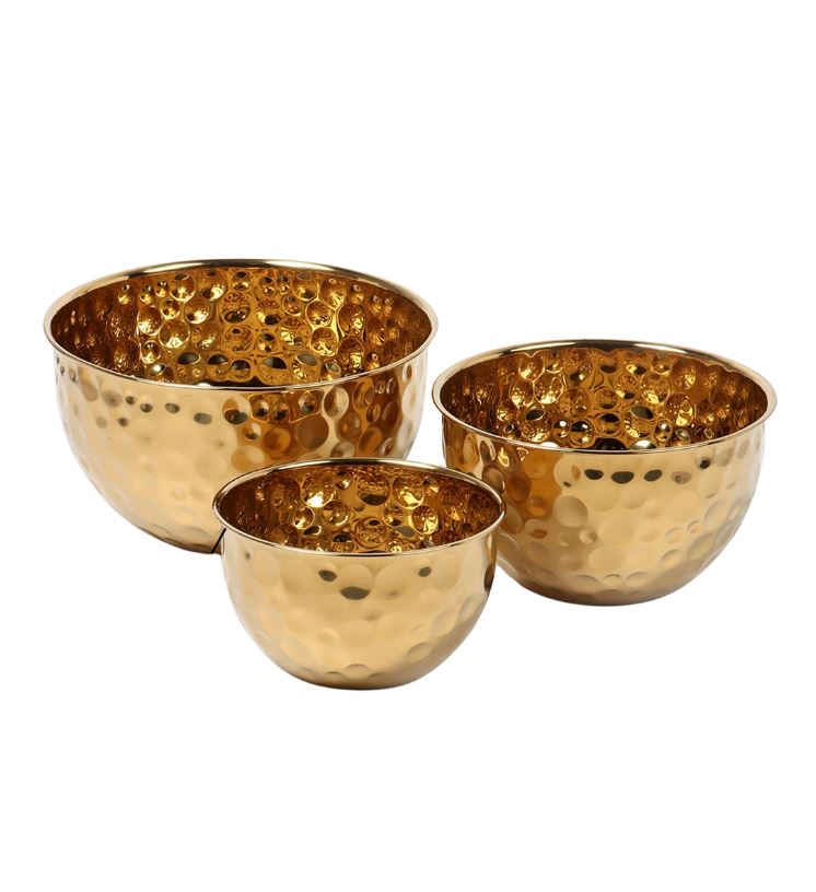 В набор входят три гармонично подобранные миски, изготовленные из прочного материала с изысканным золотистым оттенком, который добавит шарма любому столу.