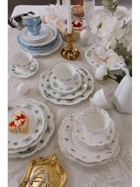 Эстетичный дизайн: Белый фарфор с зелёным цветочным узором.