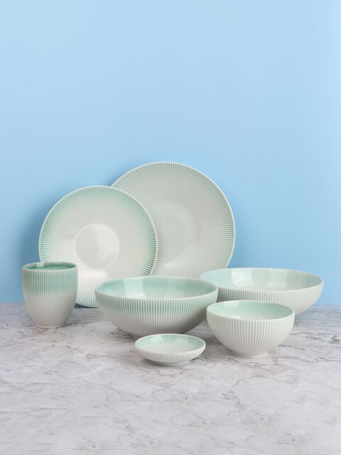 Коллекция керамической посуды Mole с глазурью в морском зеленом оттенке напоминает морские раковины и создает особое летнее настроение. Рифленые края снаружи придают изысканности.