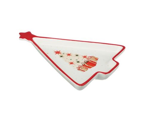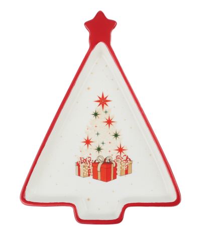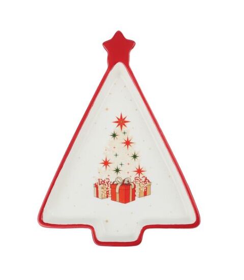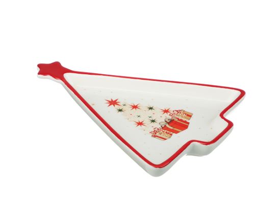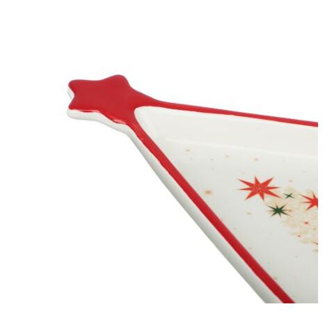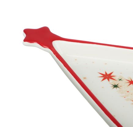 Блюдо в форме ёлки MILLIMI «Щелкунчик», 21х16х2,5 см из новогодней коллекции создаст атмосферу волшебного праздника на вашем столе, а также может стать трогательным подарком для близких. Блюдо из белой керамики с принтом в традиционных новогодних оттенках красного и зеленого гармонично впишется в тематический интерьер и добавит яркого акцента в оформление стола. Прекрасно сочетается с белой и цветной посудой, а также со столовым текстилем различных расцветок. Может использоваться для подачи рождественских десертов, а также закусок и канапе.
