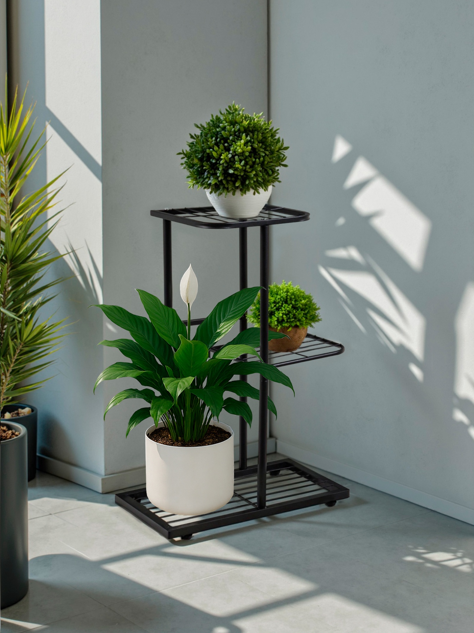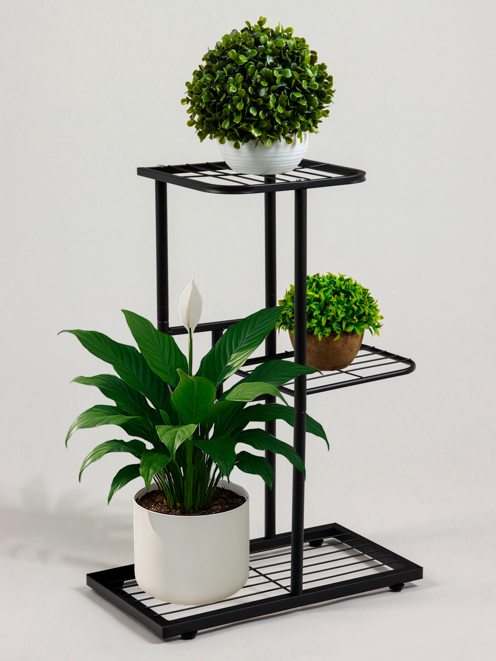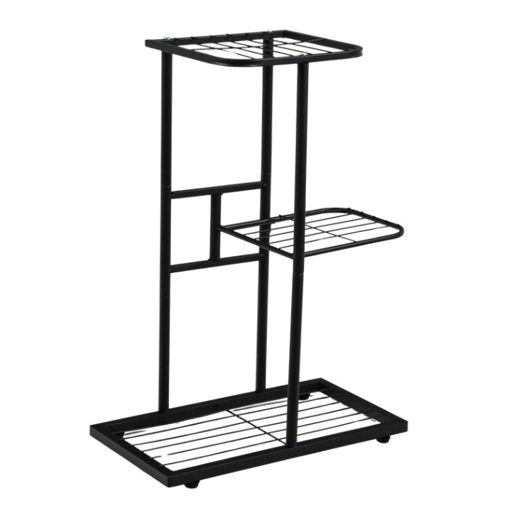 Напольная подставка для цветов с тремя полками станет стильным и функциональным дополнением интерьера. Её лаконичный дизайн и чёрный оттенок гармонично впишутся в современное пространство, подчеркнув эстетику комнаты или офиса. Устойчивая металлическая конструкция обеспечивает надёжность и долговечность, а три уровня полок позволяют эффектно разместить растения, книги или декоративные элементы.