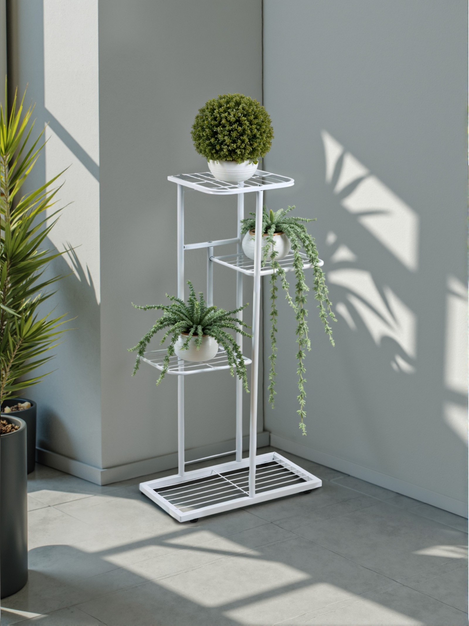 Подставка для цветов с 4 полками станет стильным решением для организации пространства на балконе, в прихожей или гостиной. Металлическая конструкция высотой 82 см обеспечивает надёжность и долговечность использования. Компактные размеры позволяют разместить горшочные растения без потери свободного места.