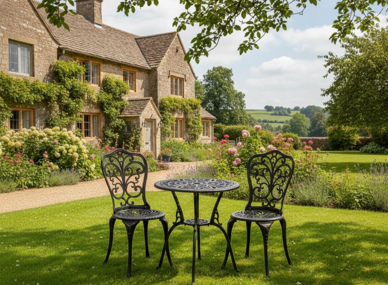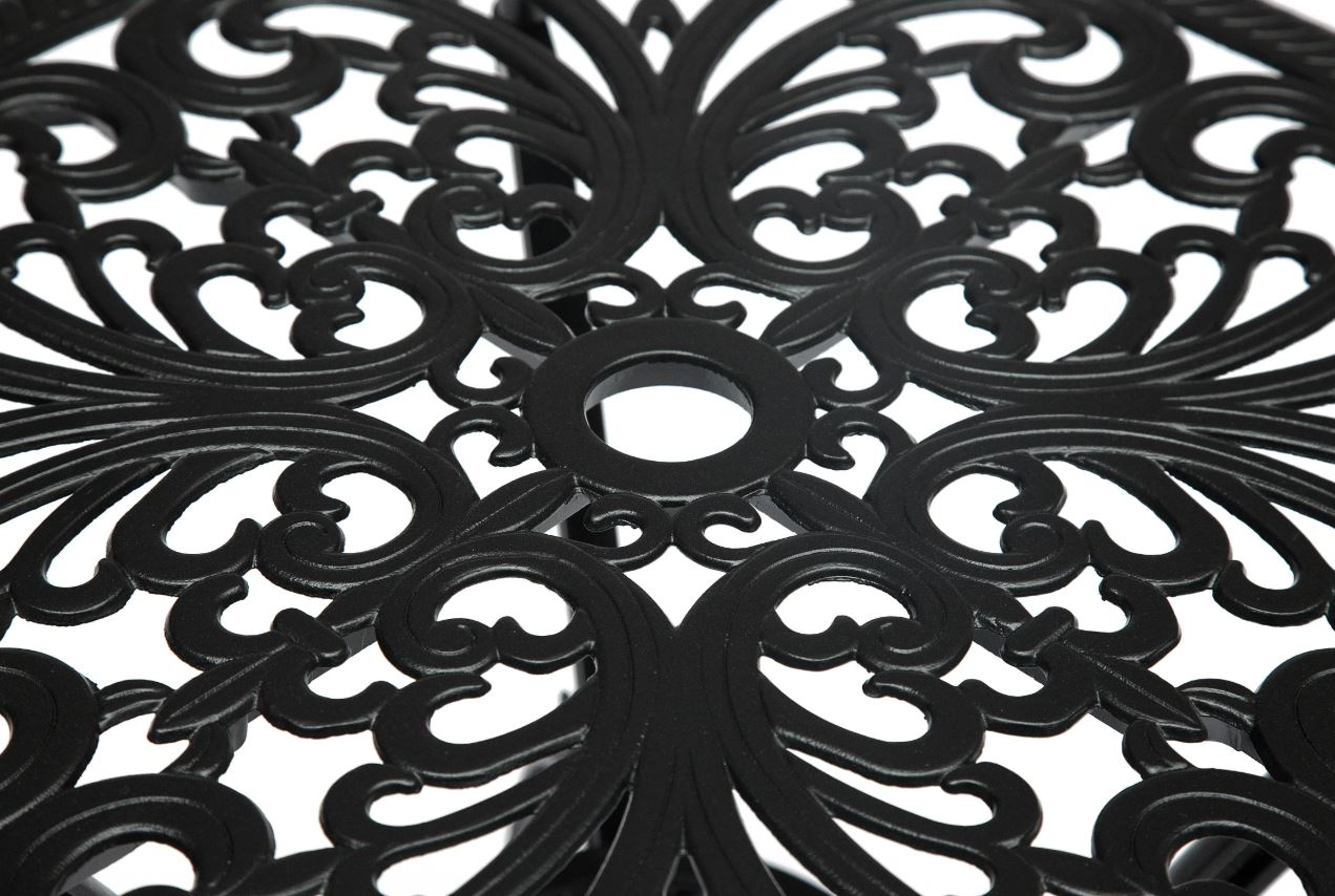 Плавные витиеватые изгибы ажурных орнаментов столешницы и спинок стульев, выполненные вручную, придают мебели утончённость и особый шарм. Художественная ковка добавляет индивидуальности экстерьеру и гармонично вписывается как в классический, так и в прованский или винтажный стиль ландшафтного дизайна.