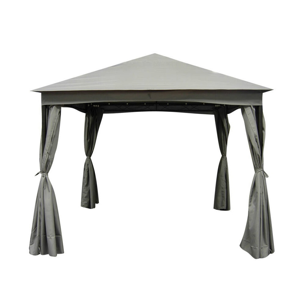 Состоит из четырех столбов, тента и штор.