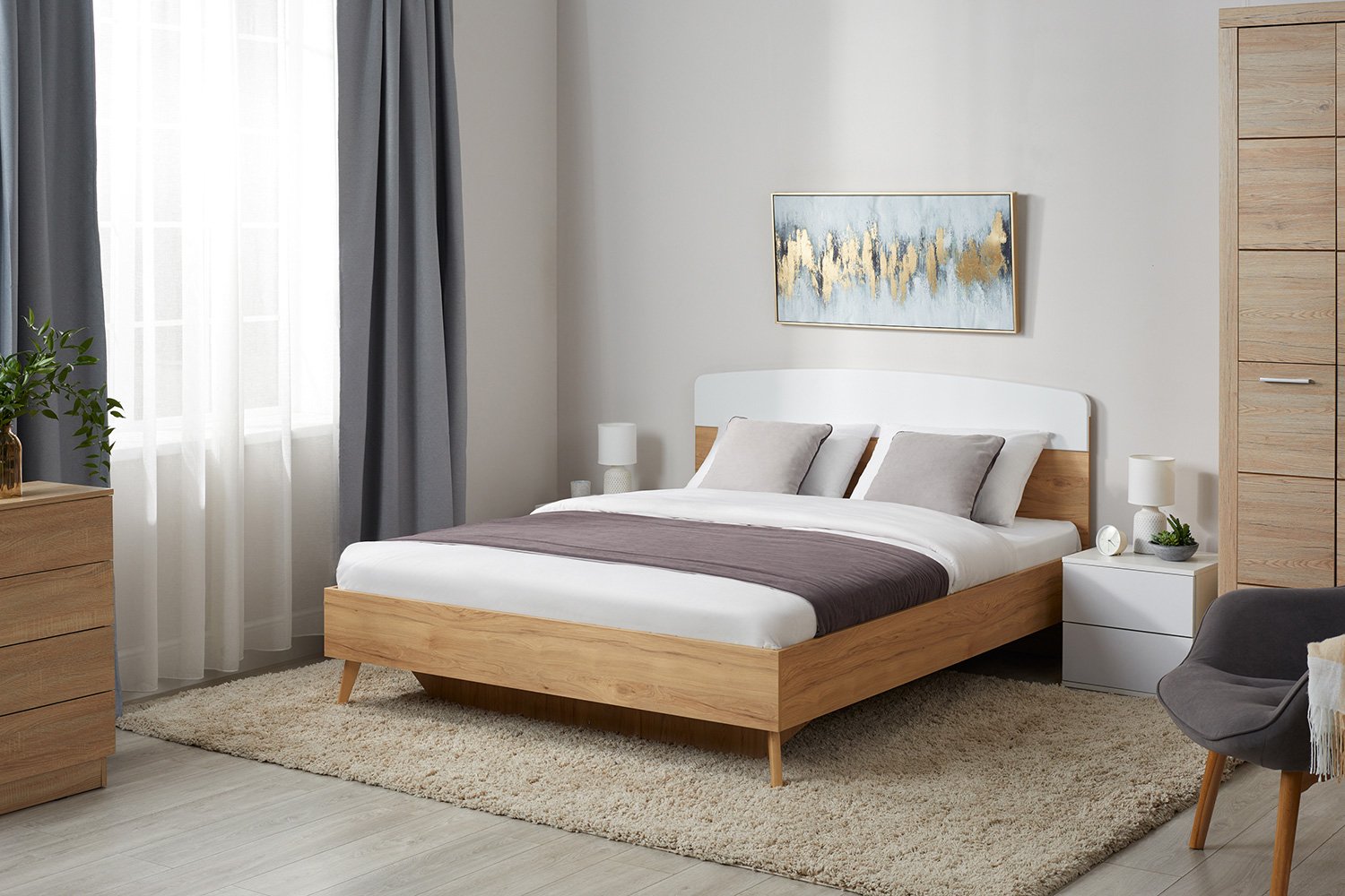 Двуспальная кровать SCANDICA Хортен шириной станет гармоничной деталью интерьера спальни в скандинавском стиле. Модель отличается простой и надежной конструкцией, выполнена в спокойных естественных тонах, без обилия декоративных элементов. Корпус и спинка кровати изготовлены из ЛДСП с покрытием цвета светлого дуба и бланж. Ножки сделаны из натурального массива березы. Скругленные углы изголовья эффектно смотрятся и делают мебель более безопасной. В комплект входит прочное ортопедическое основание на ламелях. Максимальная нагрузка на одно спальное место составляет 150 кг.
