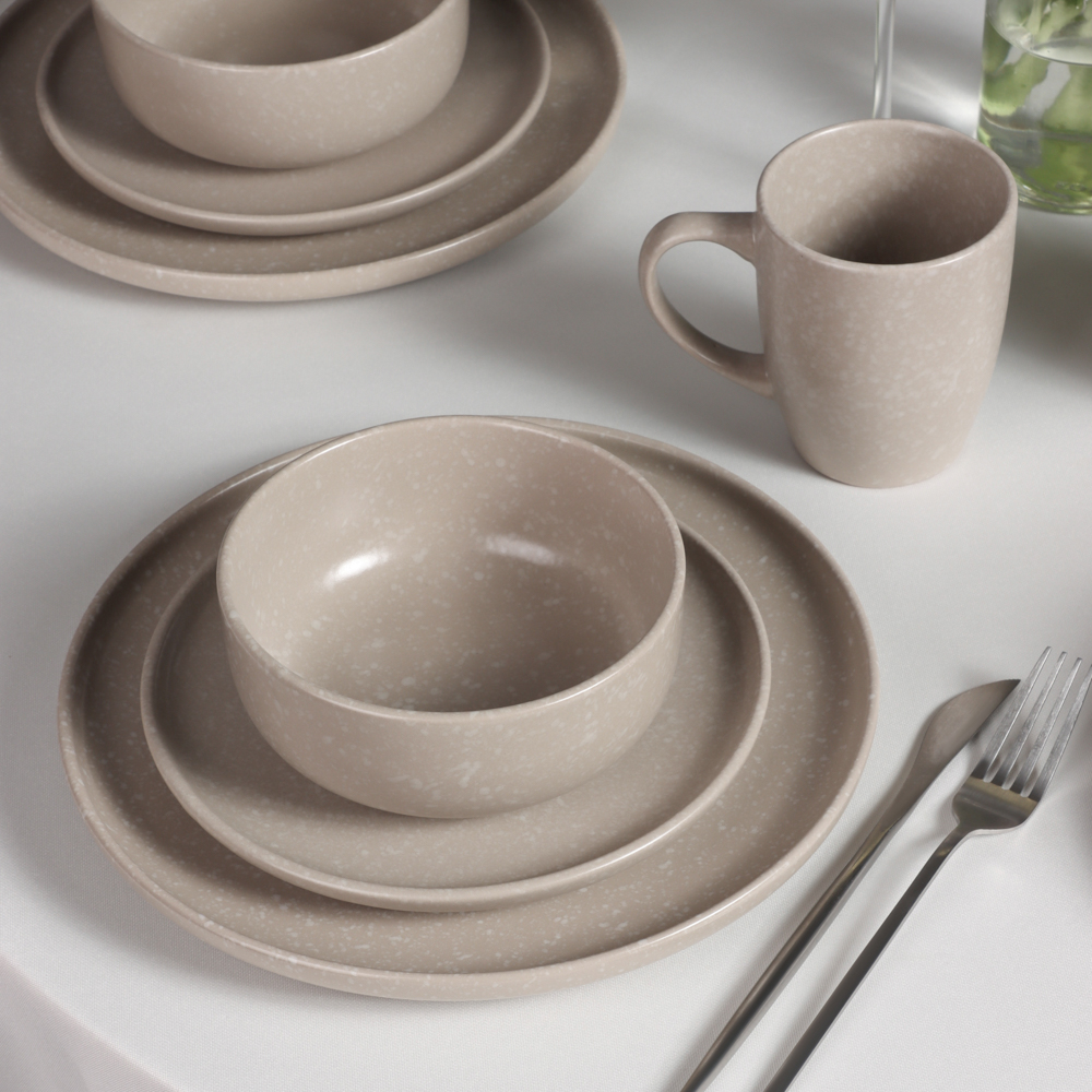 Набор столовой посуды MILLIMI из 16 предметов – это стильный сервиз на 4 персоны для сервировки повседневного и праздничного стола. В состав набора входят: 4 тарелки диаметром 26 см, 4 тарелки диаметром 20 см, 4 глубоких салатника диаметром 14 см и 4 кружки объемом 340 мл. Все предметы изготовлены из высококачественной керамики повышенной прочности, устойчивой к образованию царапин от столовых приборов. Посуда в благородном бежевом цвете смотрится современно и гармонично сочетается с любыми столовыми приборами и текстильными элементами оформления стола: салфетками, скатертями, декоративными подставками. Легко комбинируются с другой посудой. Может стать отличным подарком по случаю новоселья, годовщины, юбилея или свадьбы.