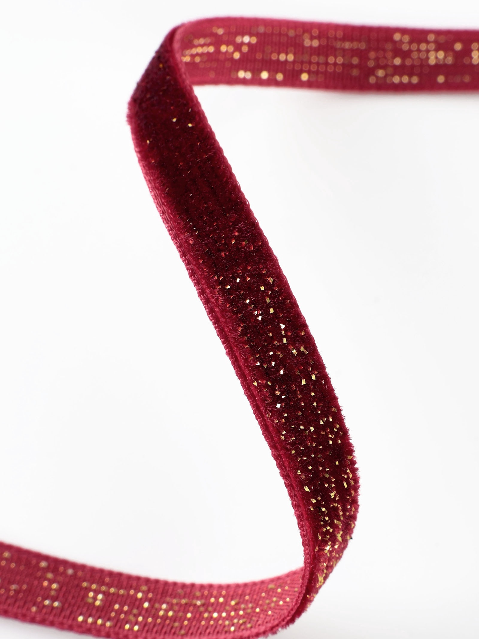 Эта узкая бархатная лента с золотым люрексом придаёт творческим проектам благородное мерцание. Сочетание глубокого бордового бархата и золотых нитей создаёт насыщенный переливающийся эффект для изысканного декора.
