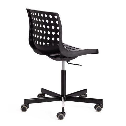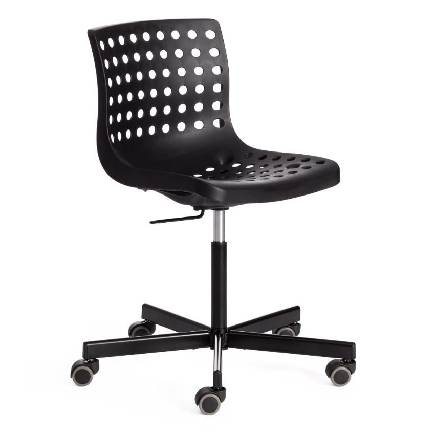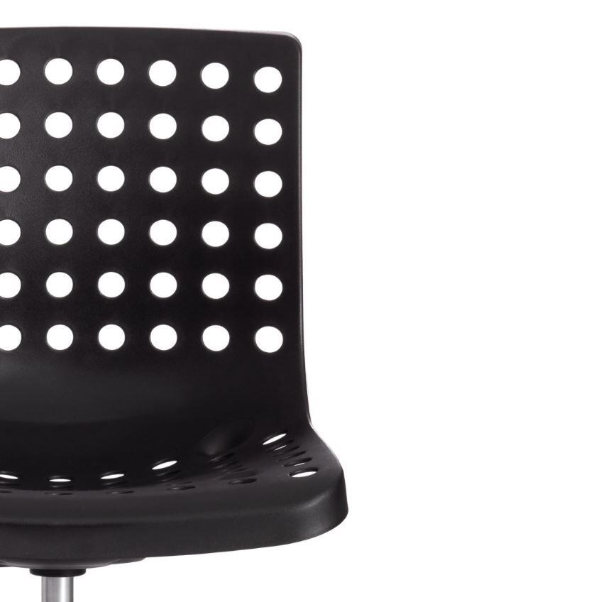 Каркас кресла выполнен из литого прочного пластика черного цвета c перфорацией. Крестовина выполнена из металла и покрашена в цвет каркаса кресла. На колесиках кресла есть прорезиненные вставки, которые предотвращают повреждение любых напольных покрытий. Модель практична, надежна, способна выдерживать большие нагрузки, устойчива к воздействию влаги, температурным перепадам и проста в уходе. Кресло очень просто в сборке, инструкция по сборке прилагается.