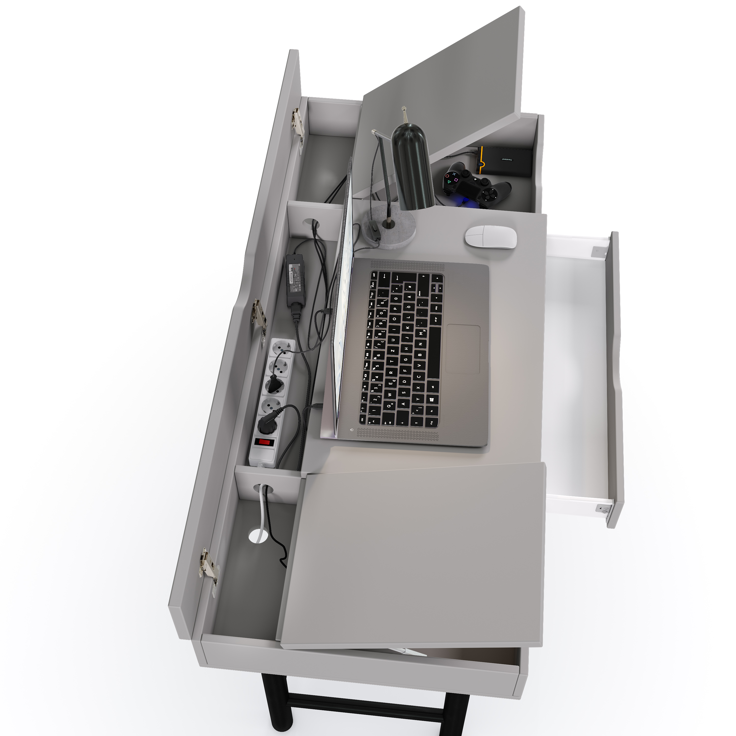 Модель разделена на 3 секции: выдвижной ящик на на метабоксах с роликовыми направляющими, 2 ящика по бокам с откидным механизмом.
