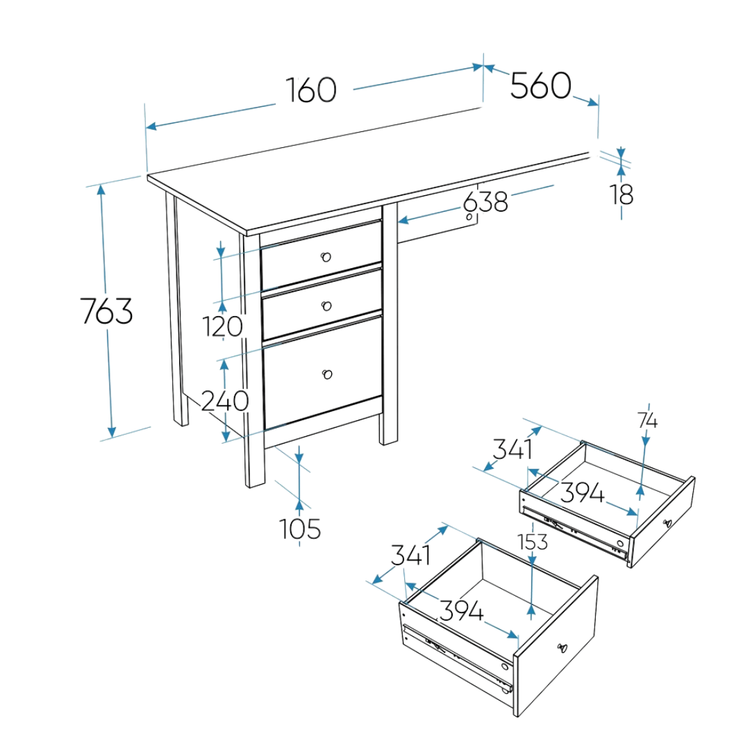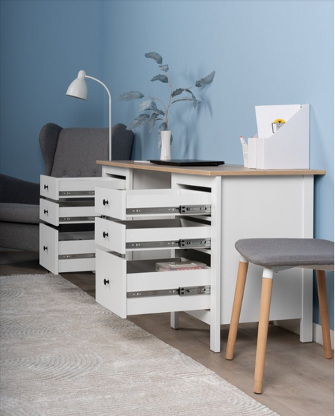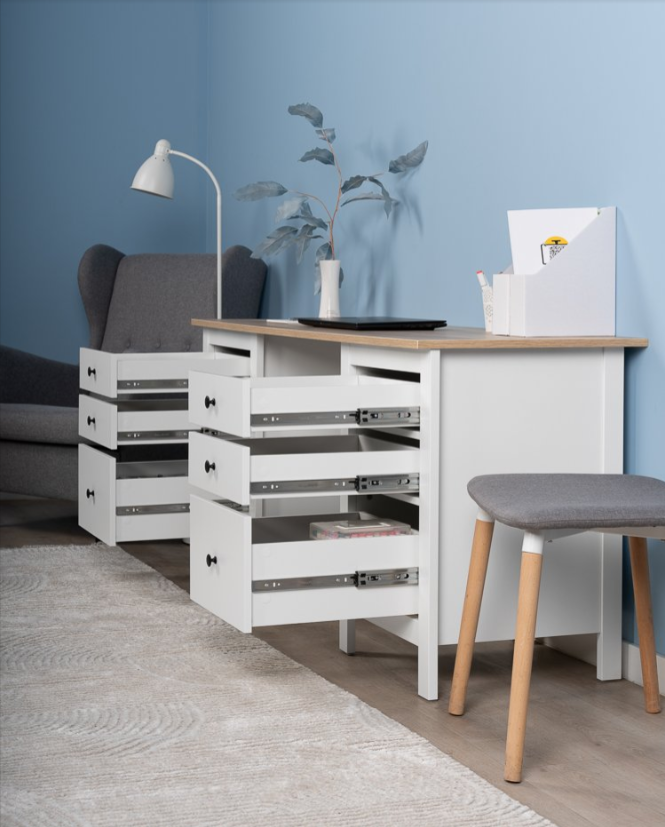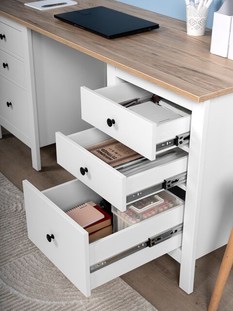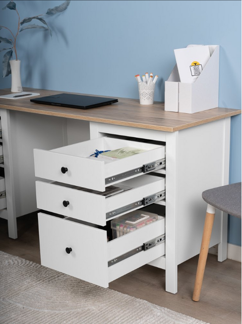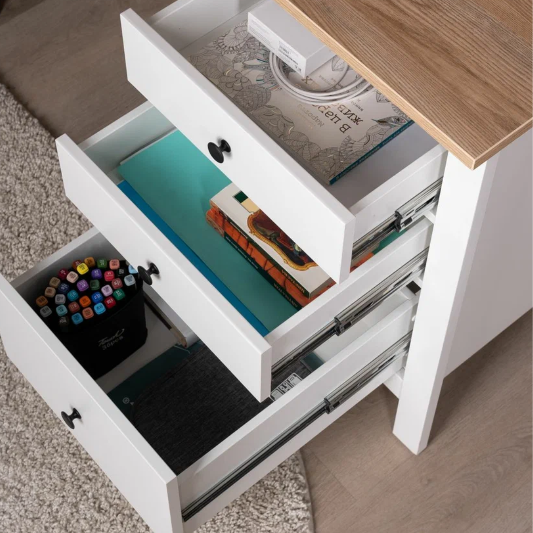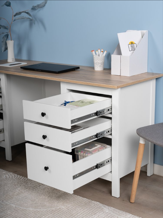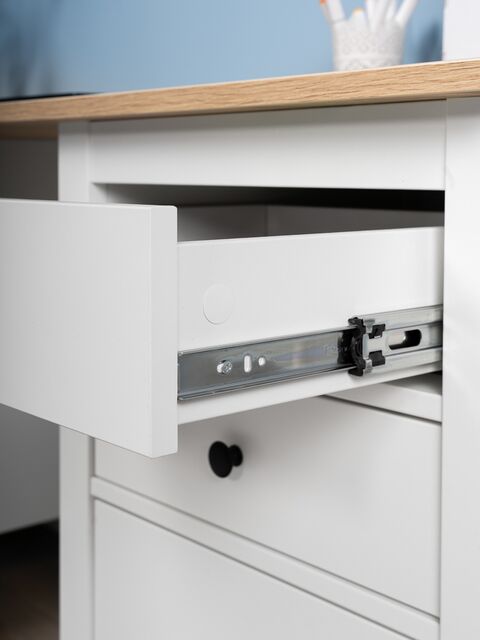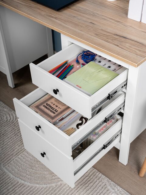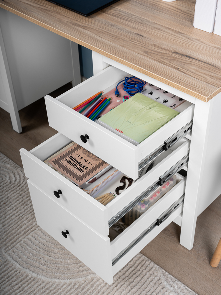 Стол оснащен тремя удобными выдвижными ящиками с направляющими полного выдвижения и доводчиками, которые обеспечивают плавное и бесшумное открывание. Эти ящики предназначены для хранения канцелярии, документов, учебников и других мелочей, которые всегда должны быть под рукой. Такое решение помогает поддерживать порядок и организованность, создавая комфортные условия для работы или учебы.