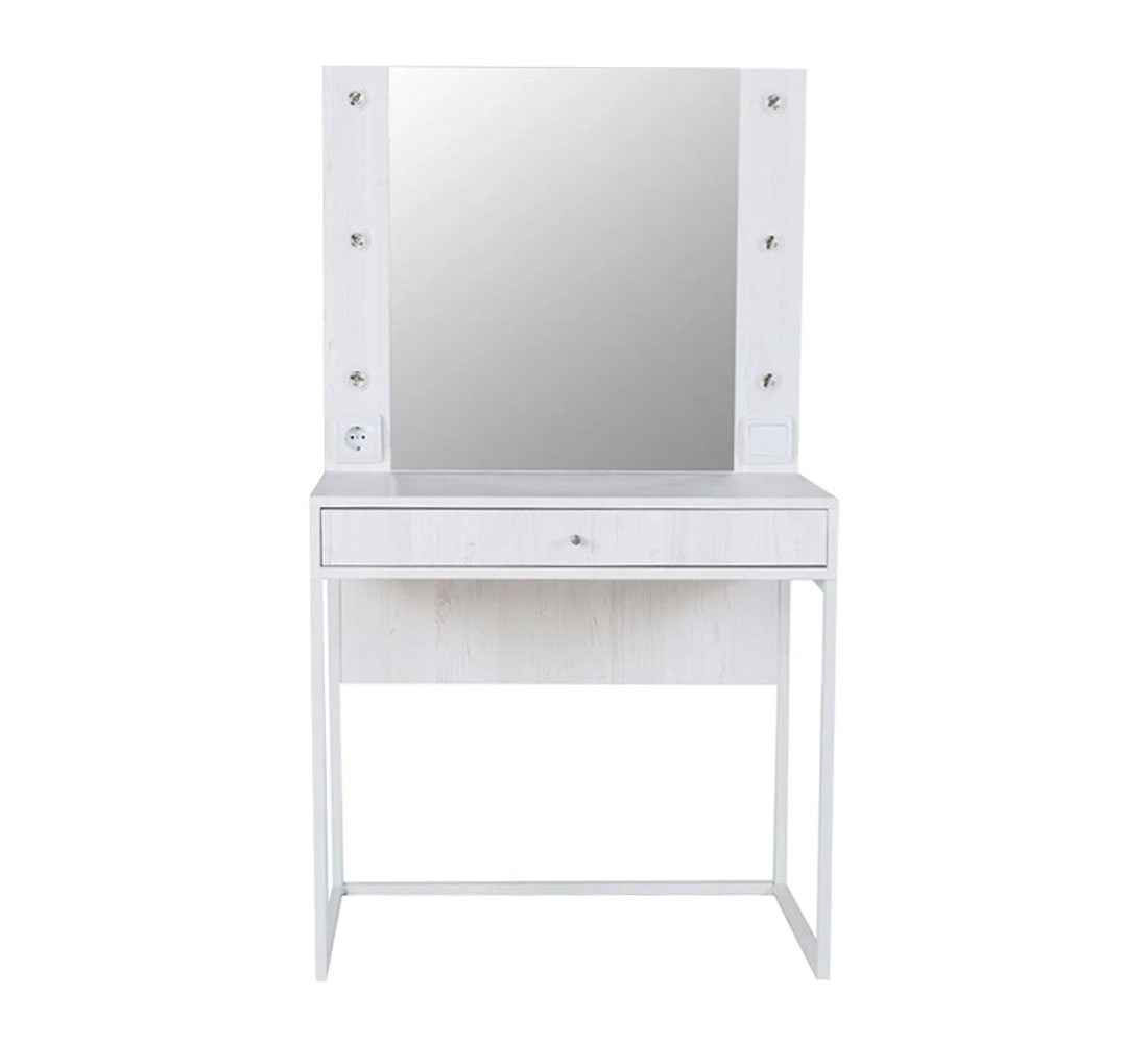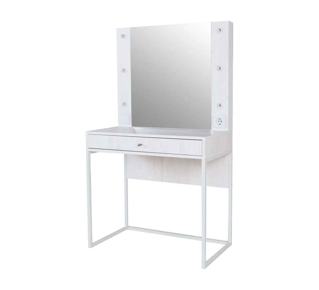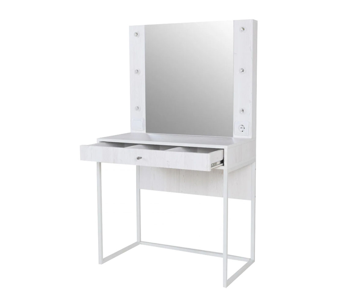 Трюмо «БЕРГЕН» имеет опоры из металлической профильной трубы, вместительный ящик с тремя отсеками для мелочей и большое зеркало с фацетом.