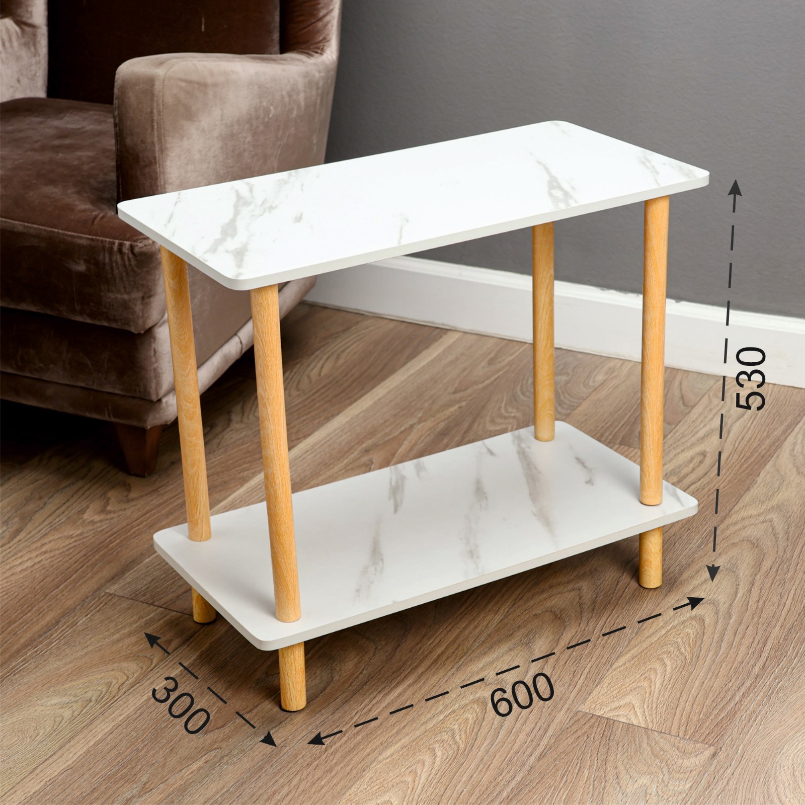 Столик журнальный ХАУС прекрасно впишется в гостиную, спальню или офис. Стильная столешница и полки, выполненные с текстурой под мрамор, позволяют разместить на себе много различных вещей.