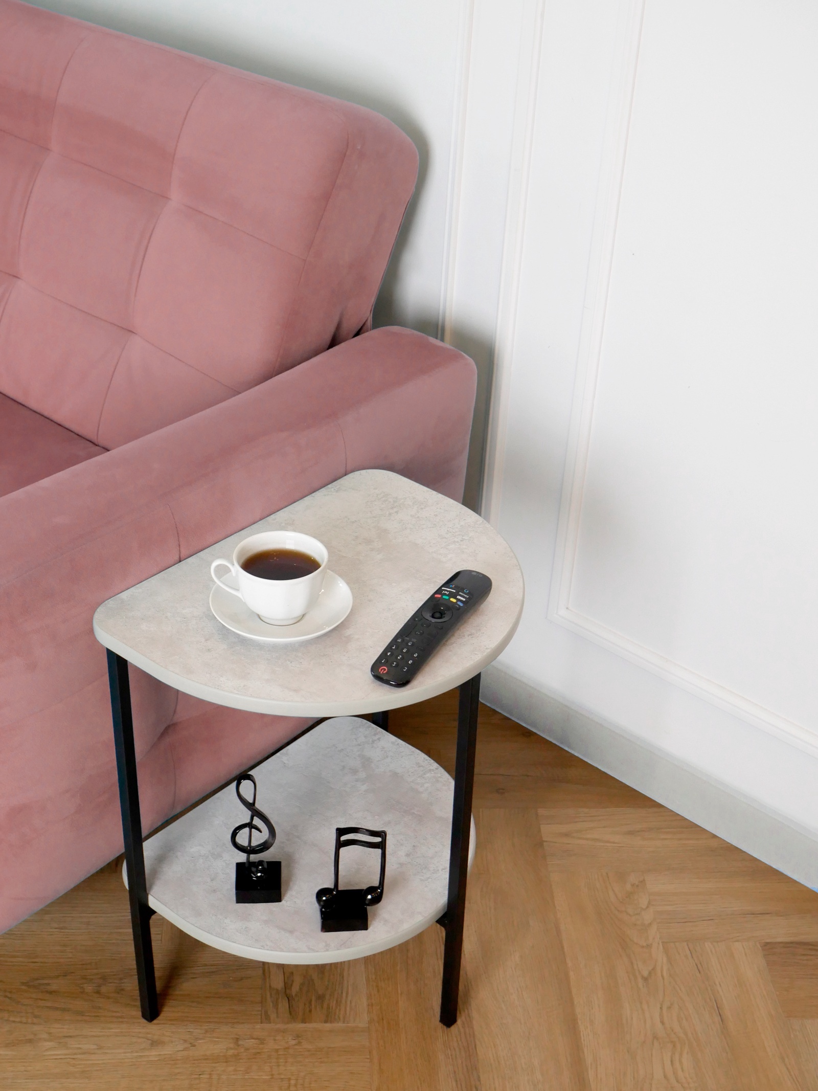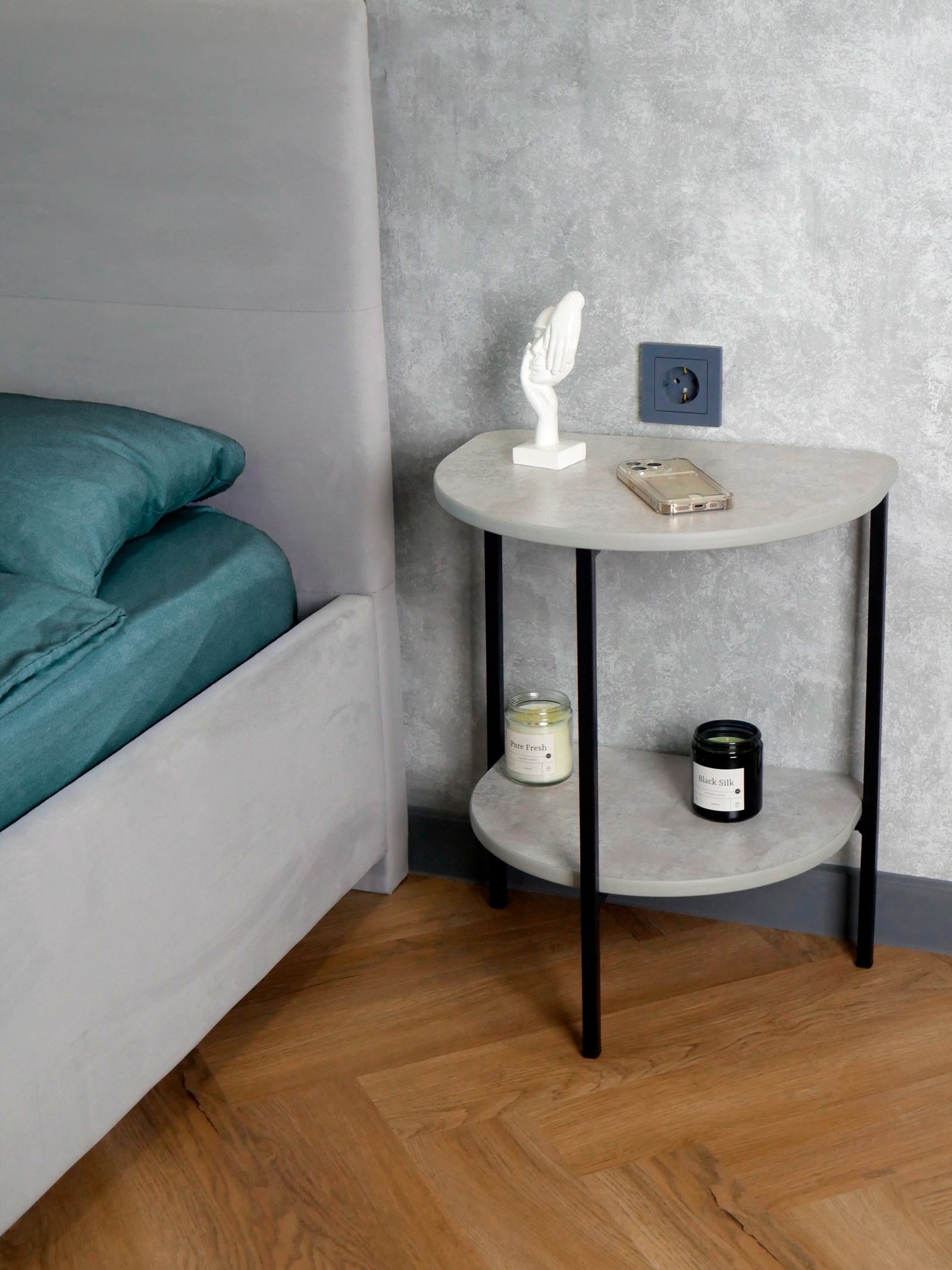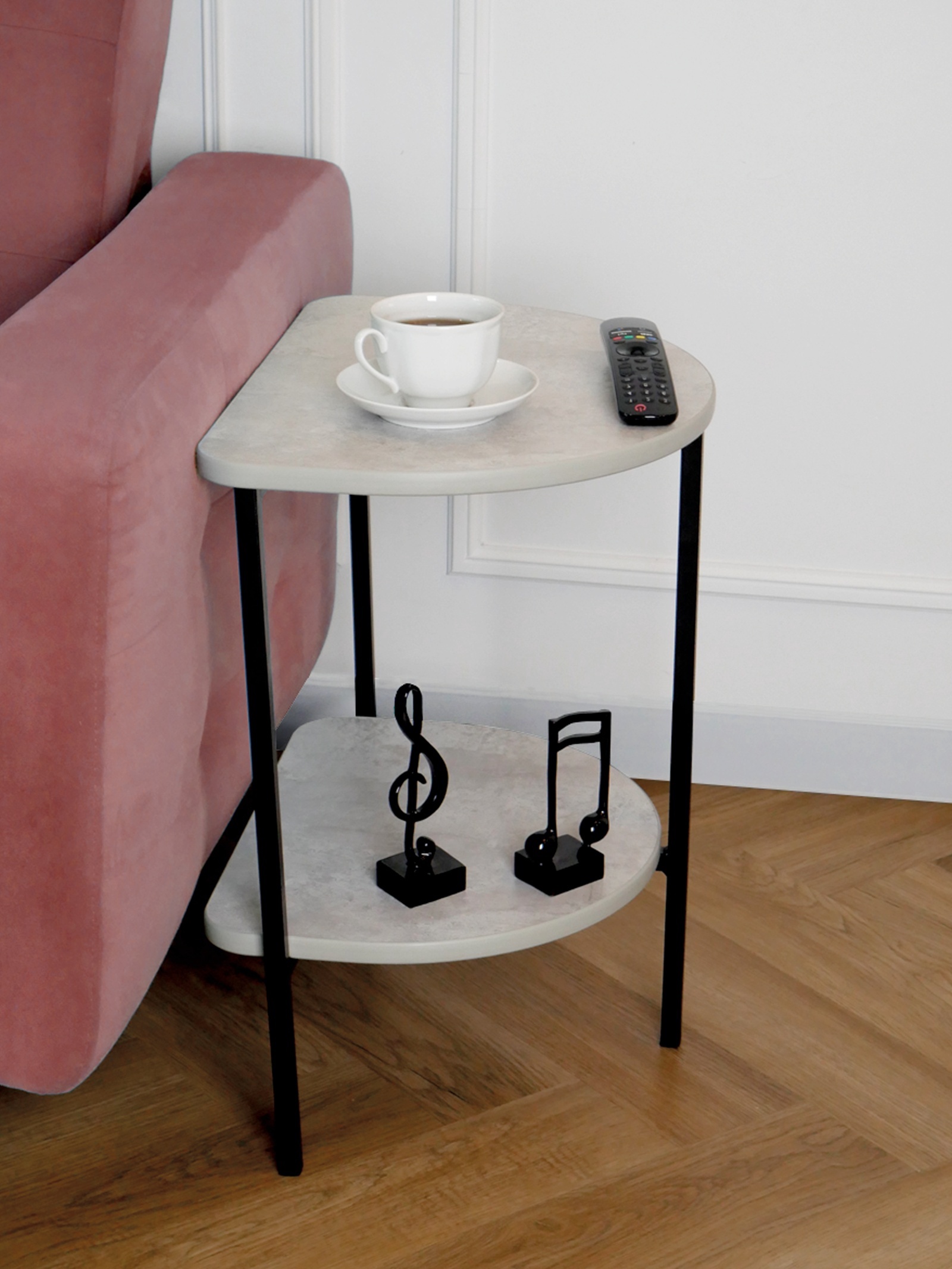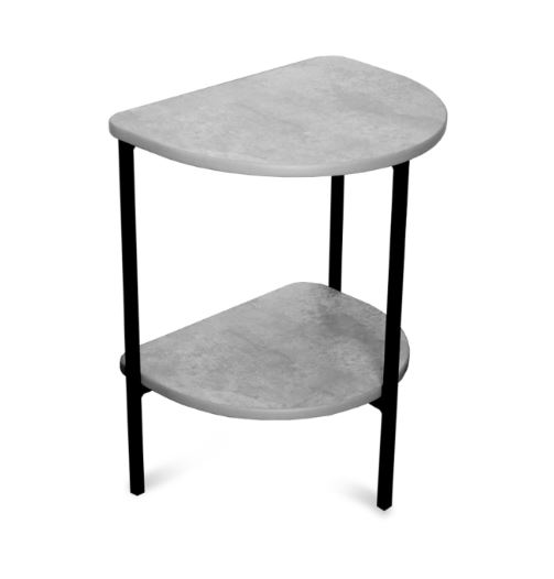 Компактное и стильное решение для создания дополнительной функциональной поверхности в интерьере. Приставной столик выполнен в актуальном оттенке цемент, который привносит в пространство нотки индустриальной эстетики и современного минимализма. Оригинальная полукруглая форма и компактные размеры позволяют разместить столик в любом удобном месте — рядом с диваном, креслом или кроватью.
