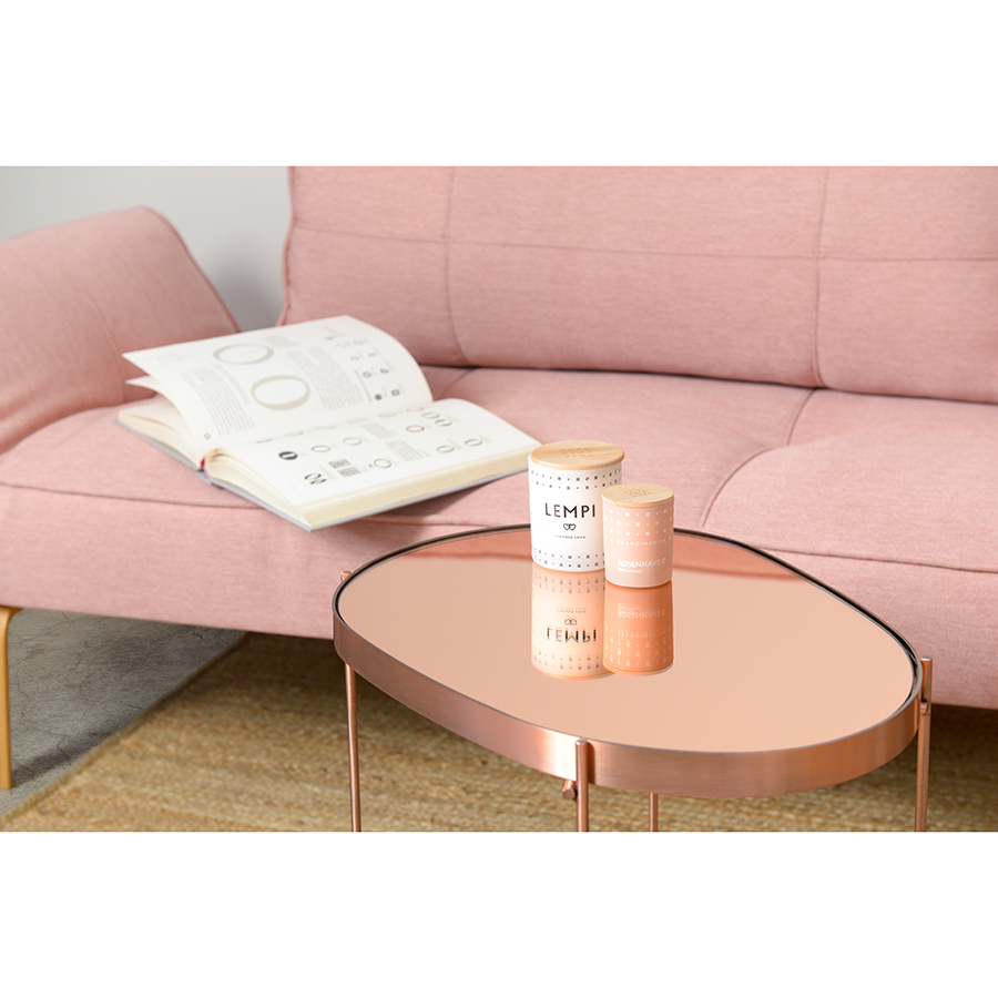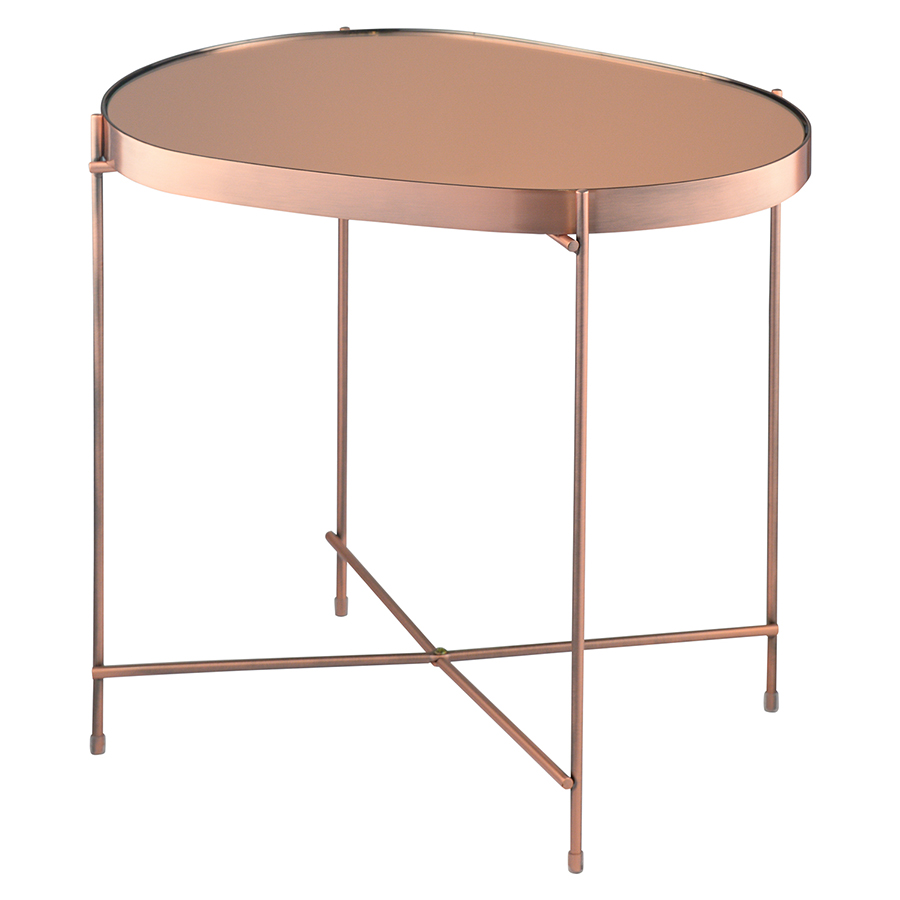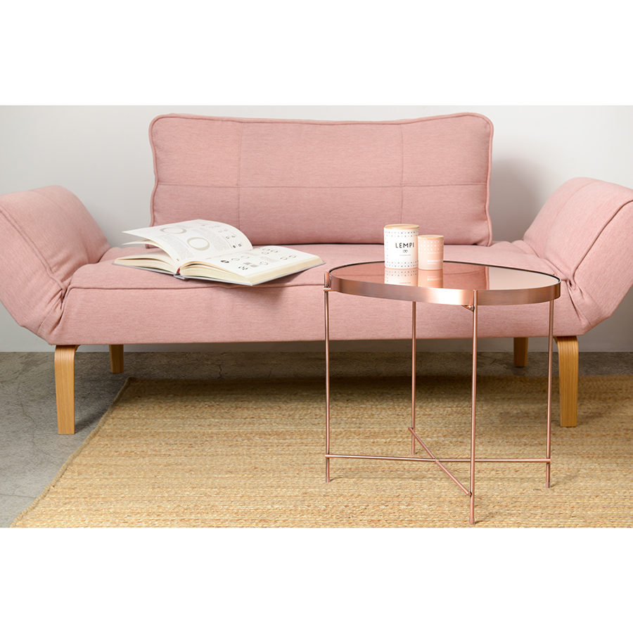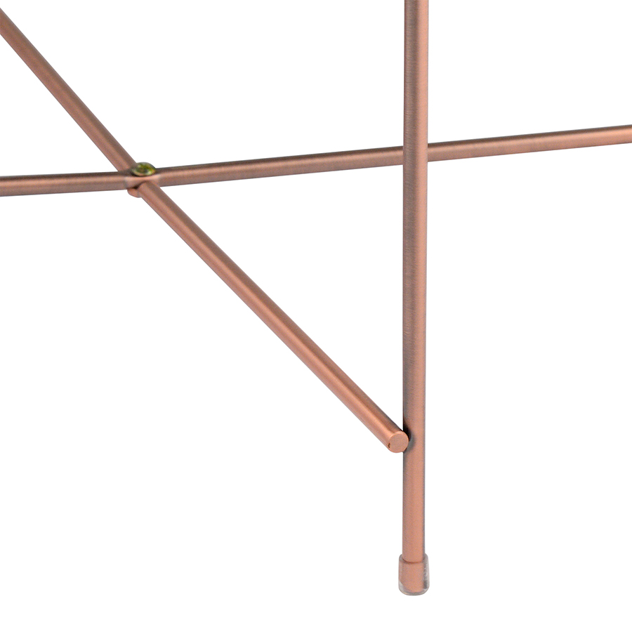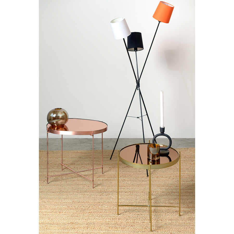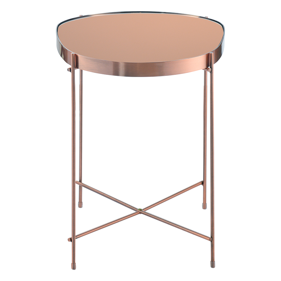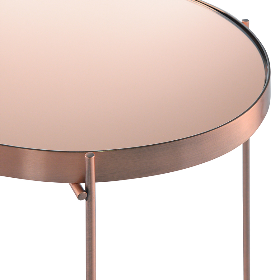 Материалы: столешница – розовое зеркало, каркас – сталь с медным напылением. Размеры: 50х45х36 см.