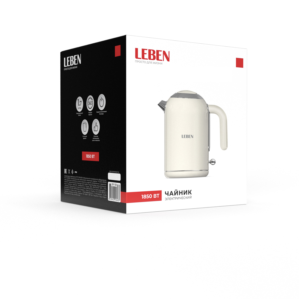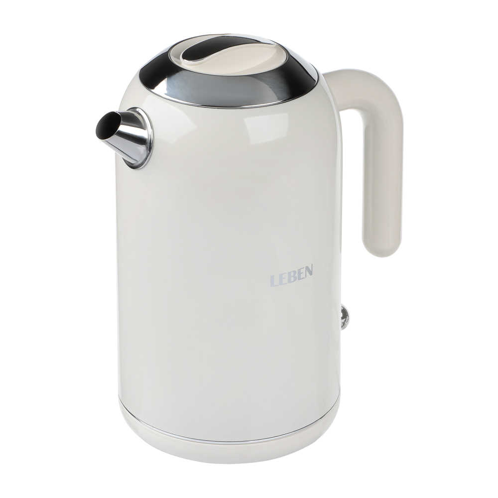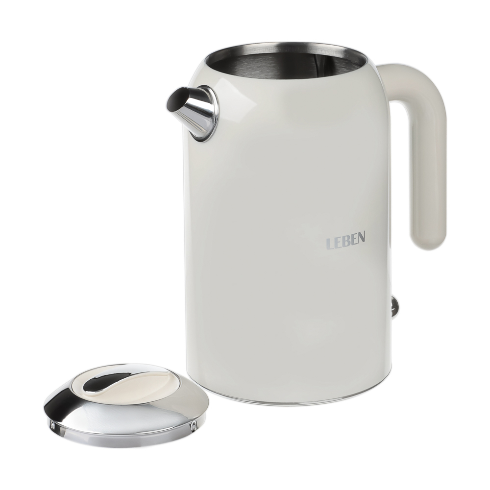 Электрический чайник LEBEN – это стильное и функциональное решение для современной кухни. Изготовленный из высококачественной нержавеющей стали, прибор не только эффектно смотрится на любой столешнице, но и гарантирует длительный срок службы. Благодаря мощности 1850 Вт вода в чайнике закипает в считанные минуты, что особенно ценно в утренней суете. Скрытый нагревательный элемент делает уход за прибором максимально простым, а поворотный механизм на 360 градусов позволяет удобно разместить чайник с любой стороны основания.