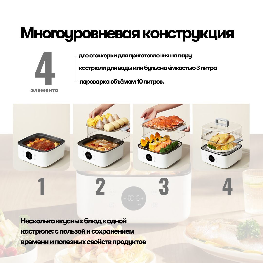 Многофункциональный прибор с трехкомпонентной конструкцией, объединяющий 3-литровую кастрюлю и просторную 10-литровую пароварку для гибкого приготовления блюд.